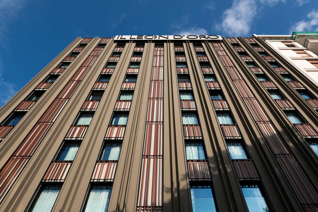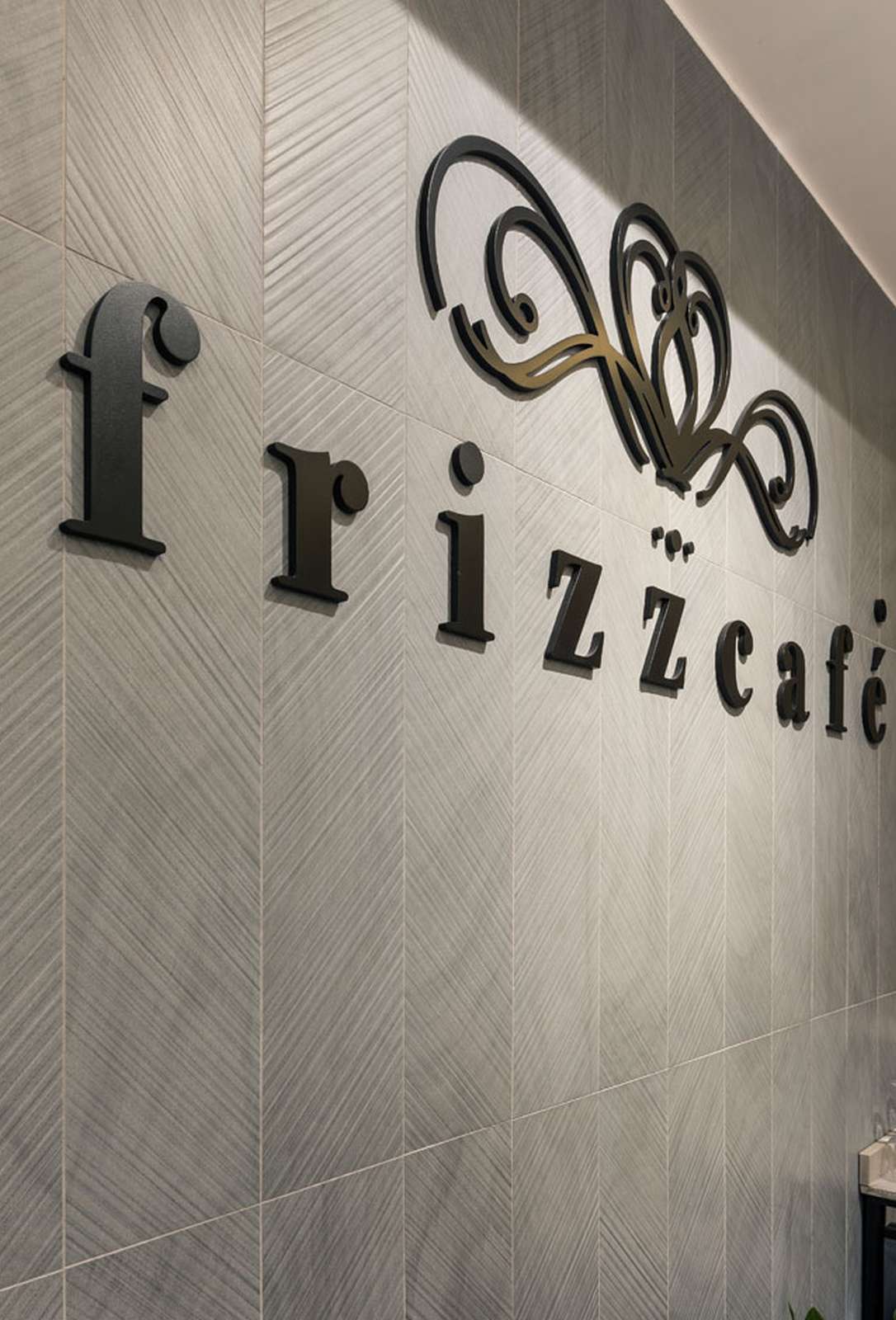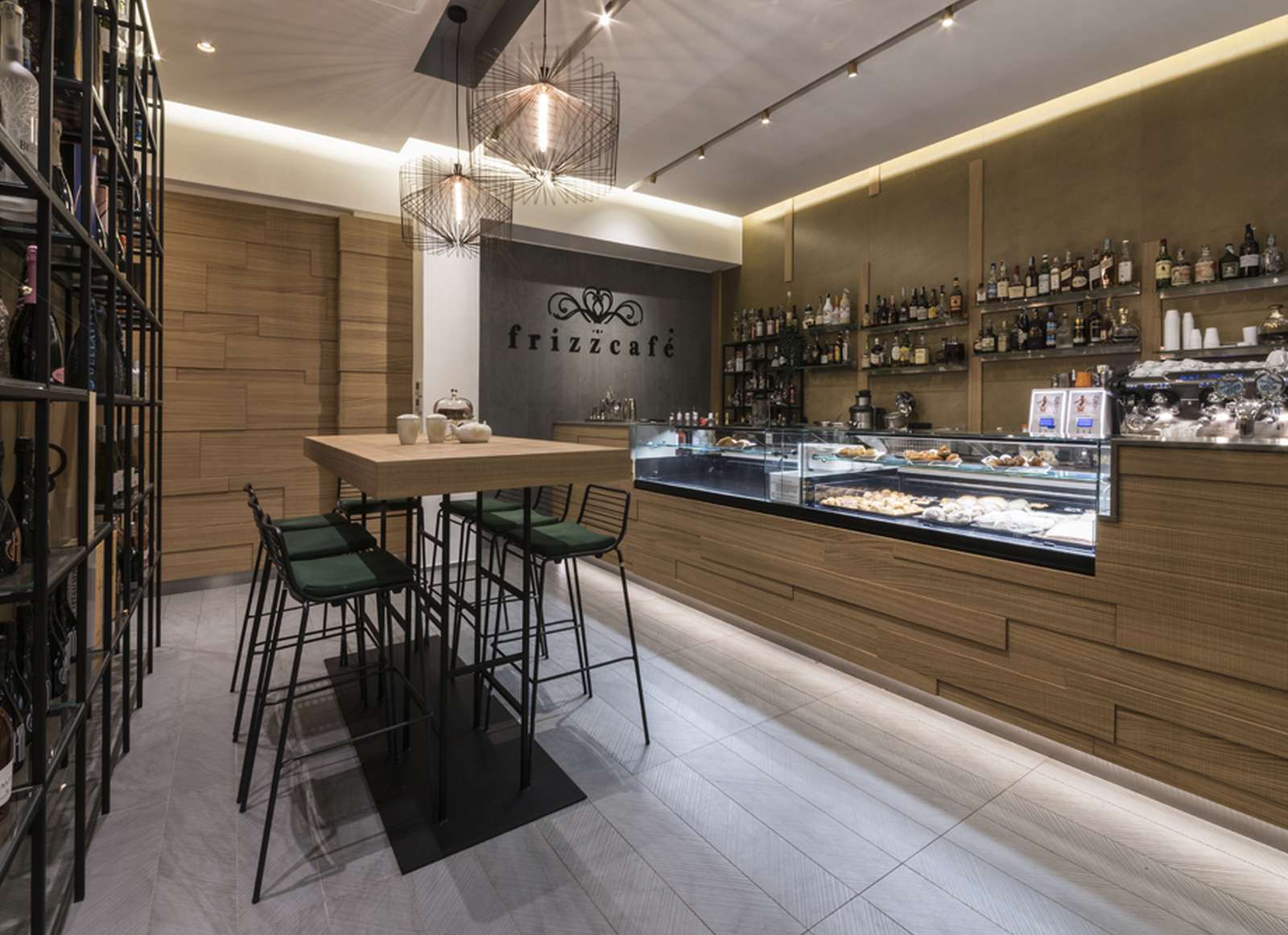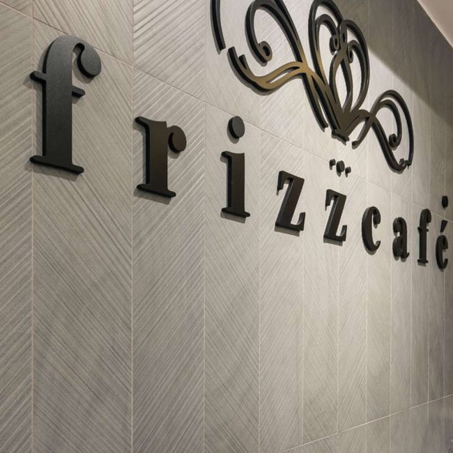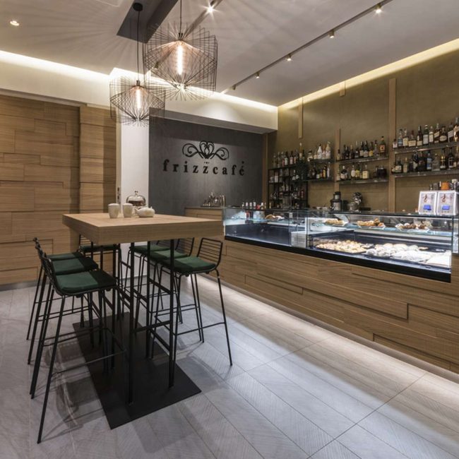 Oggi il Frizzcafé si apre alla città attraverso ampie vetrate che introducono in un ambiente dinamico, dove forme e cromie scandiscono lo spazio. Centrale è la ricerca materica: la pavimentazione, caratterizzata da una geometria in rilievo a matrice chevron, si estende lungo i 90 mq del locale per poi risalire sulla parete di fondo, trasformandosi in supporto del logo.
