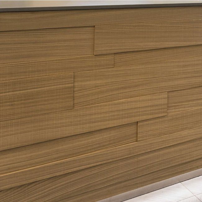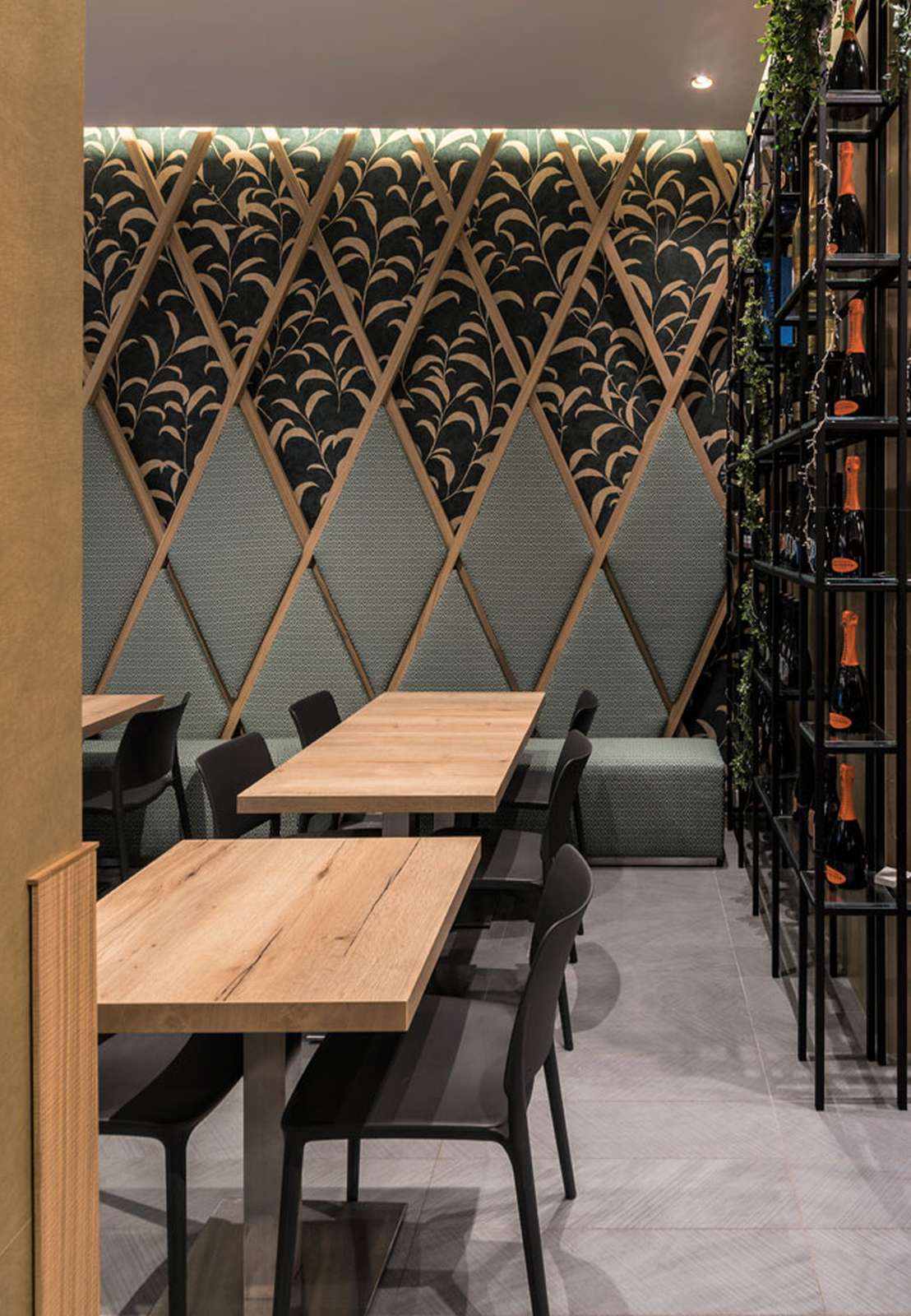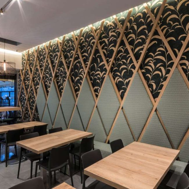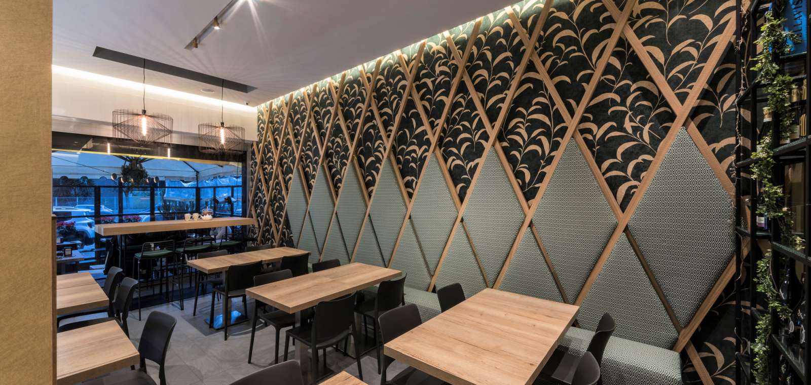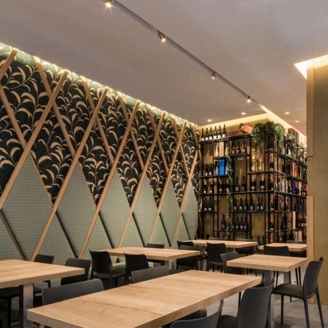 Il legno è protagonista dell’intervento. Presente nei tavoli, nelle geometrie scenografiche a parete e nel grande bancone, contribuisce a definire l’identità del progetto. Il bancone, imponente e monolitico, si sviluppa in lunghezza grazie ad assi di spessore variabile, interrotte soltanto dagli espositori in vetro che ne alleggeriscono la linearità. Sulla parete opposta, le losanghe lignee richiamano lo stesso linguaggio formale, valorizzando l’utilizzo del rovere a filo sega.