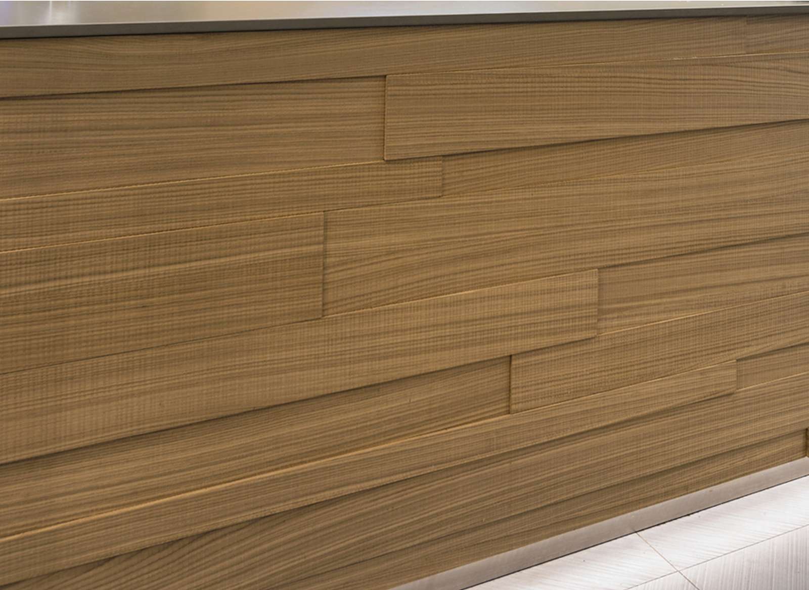 Il progetto si arricchisce attraverso una stratificazione di materiali: la vivace carta da parati e gli elementi imbottiti introducono nuovi segni e funzioni, mentre il retrobanco, rivestito con grandi lastre Laminam da 3 mm, si configura come un fondale essenziale che cela gli elementi tecnici. Qui il dialogo tra legno e metallo crea un equilibrato contrasto tra calore e rigore.
