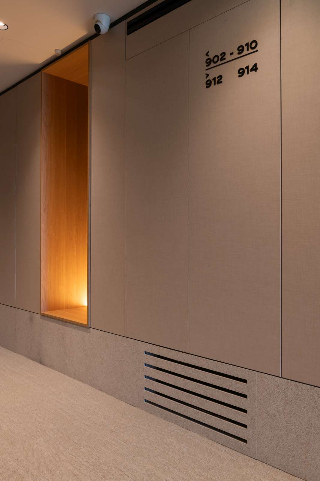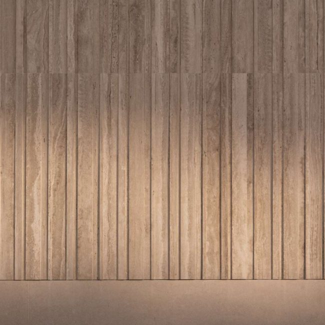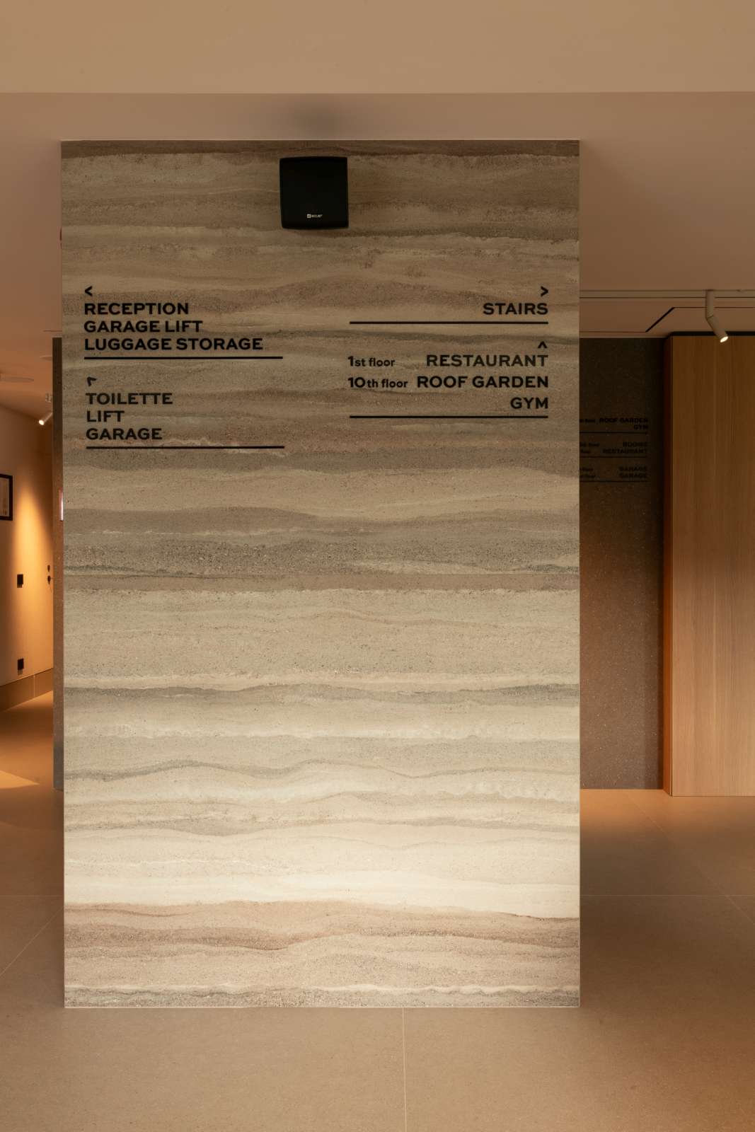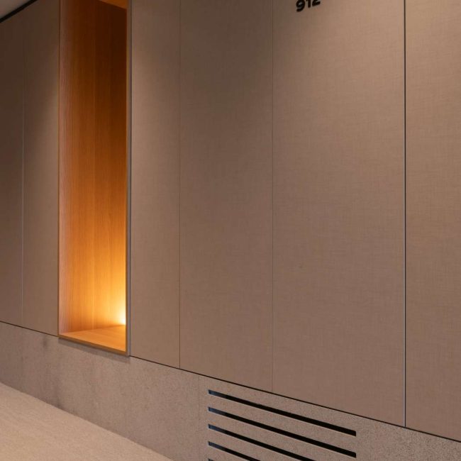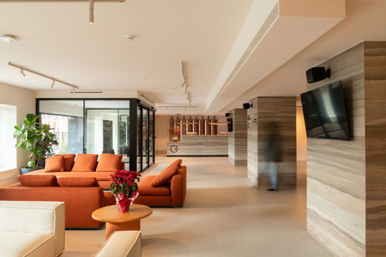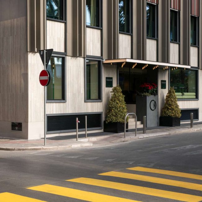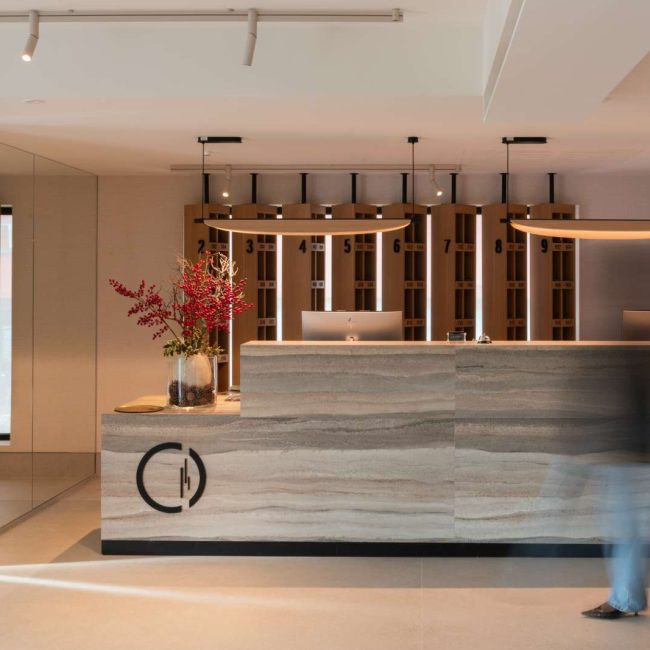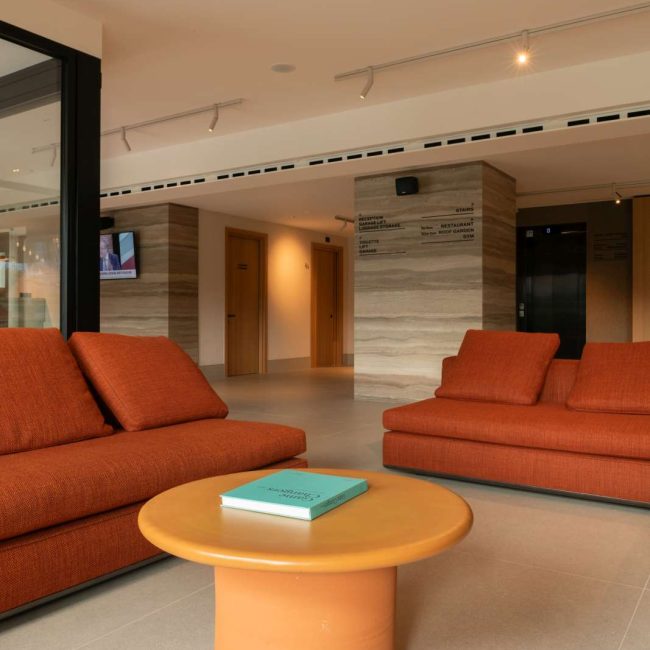 La hall al piano terra è concepita come spazio fluido e invitante: reception e lounge dialogano in continuità visiva, mentre le ampie finestre si aprono verso la rinnovata piazza Aldo Moro. Il banco reception e le colonne strutturali, rivestiti in lastre di gres porcellanato effetto travertino con stratigrafia ispirata alla sabbia e ai paesaggi pugliesi, conferiscono all’insieme un’identità tattile e visiva che unisce storia, natura e contemporaneità.