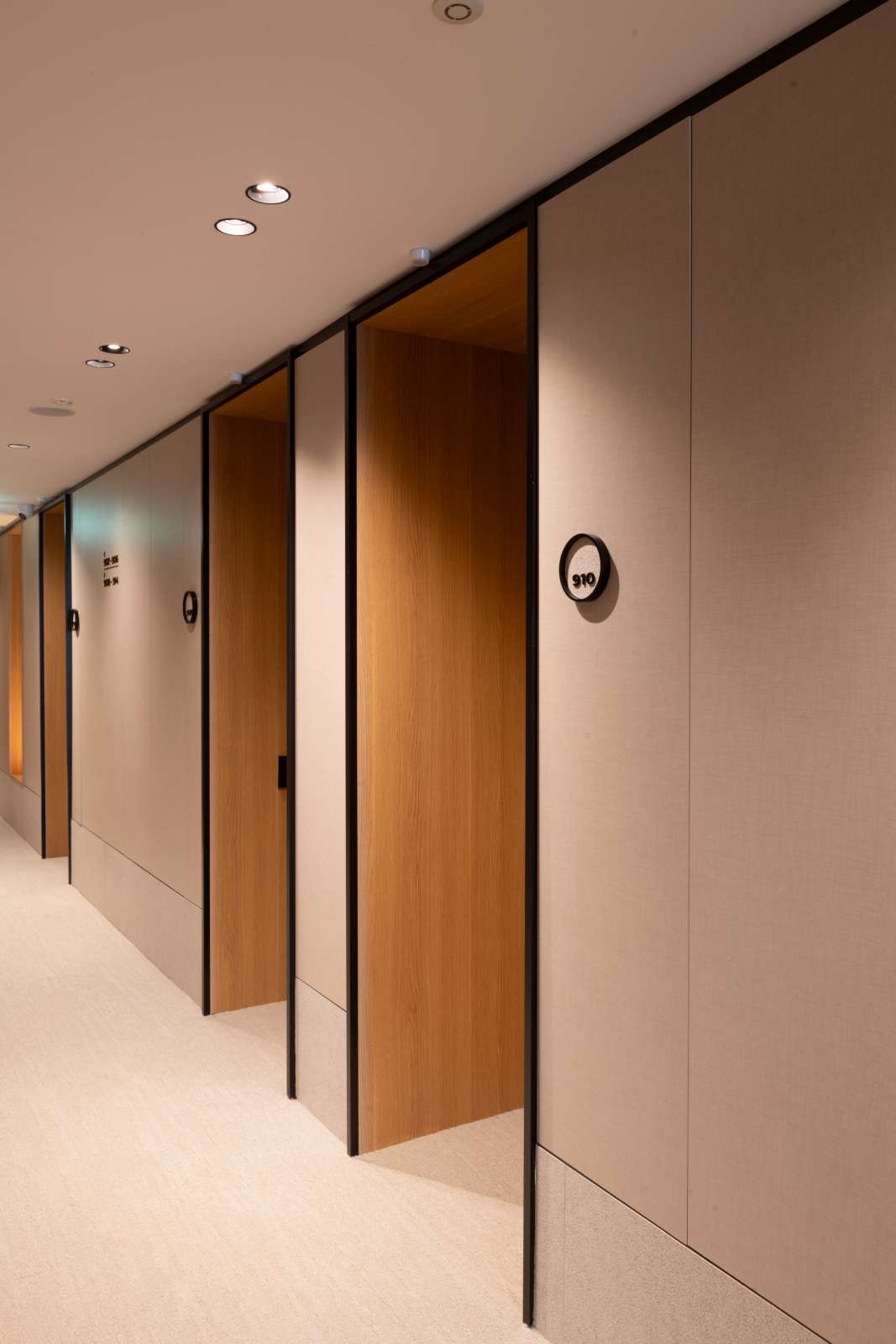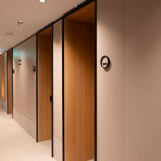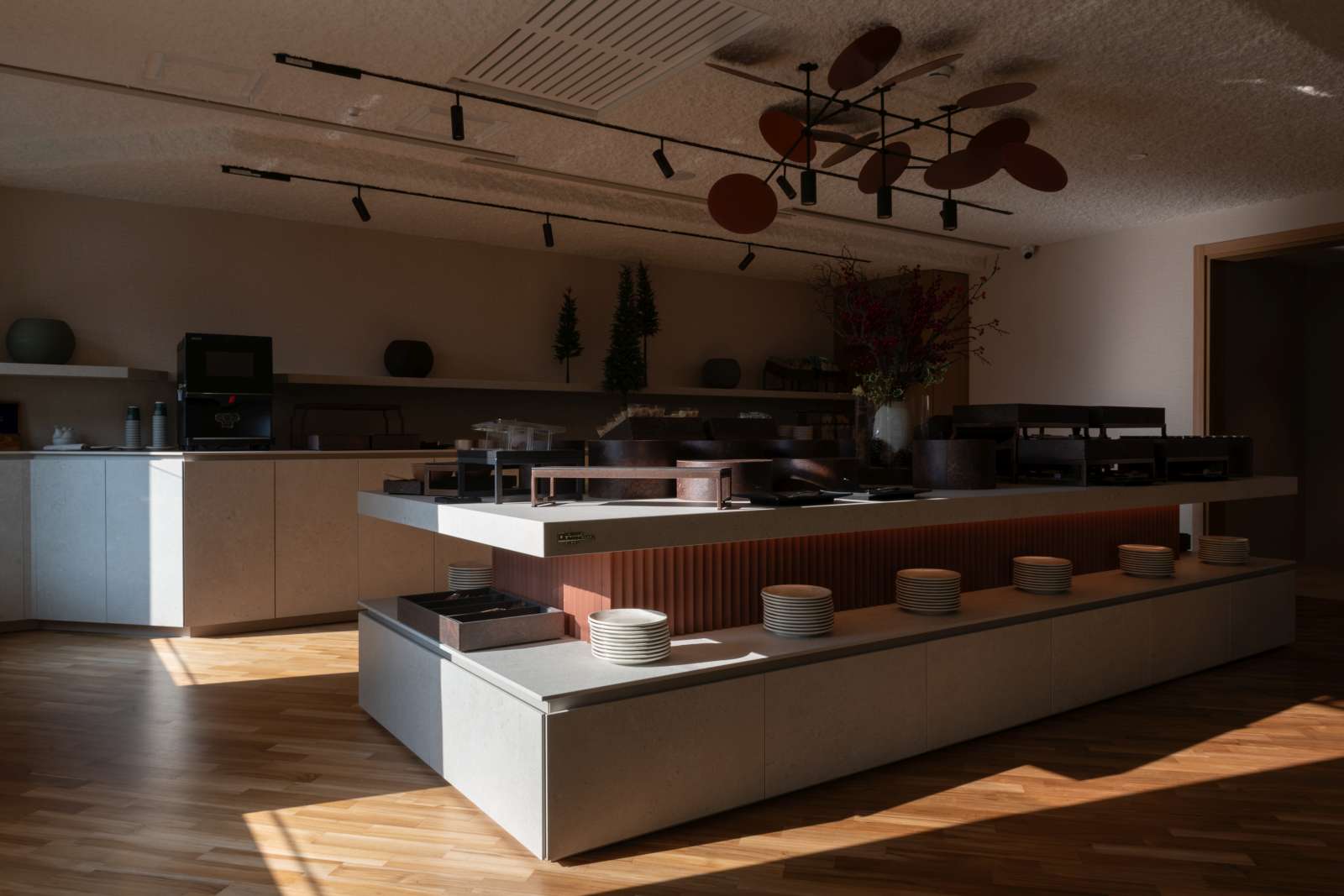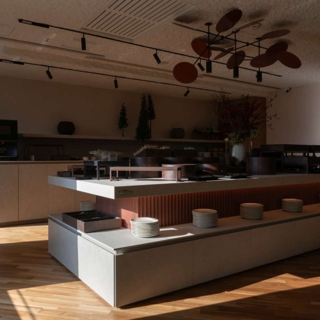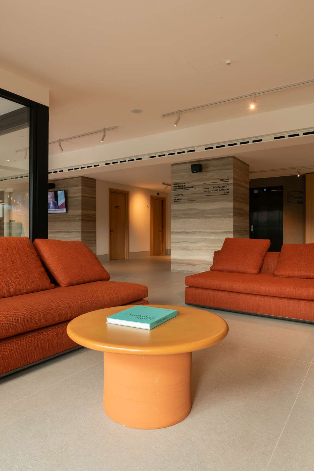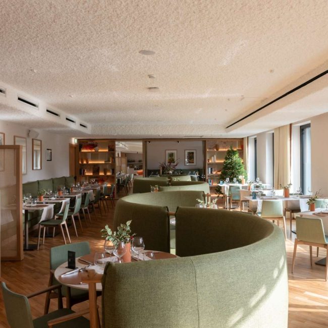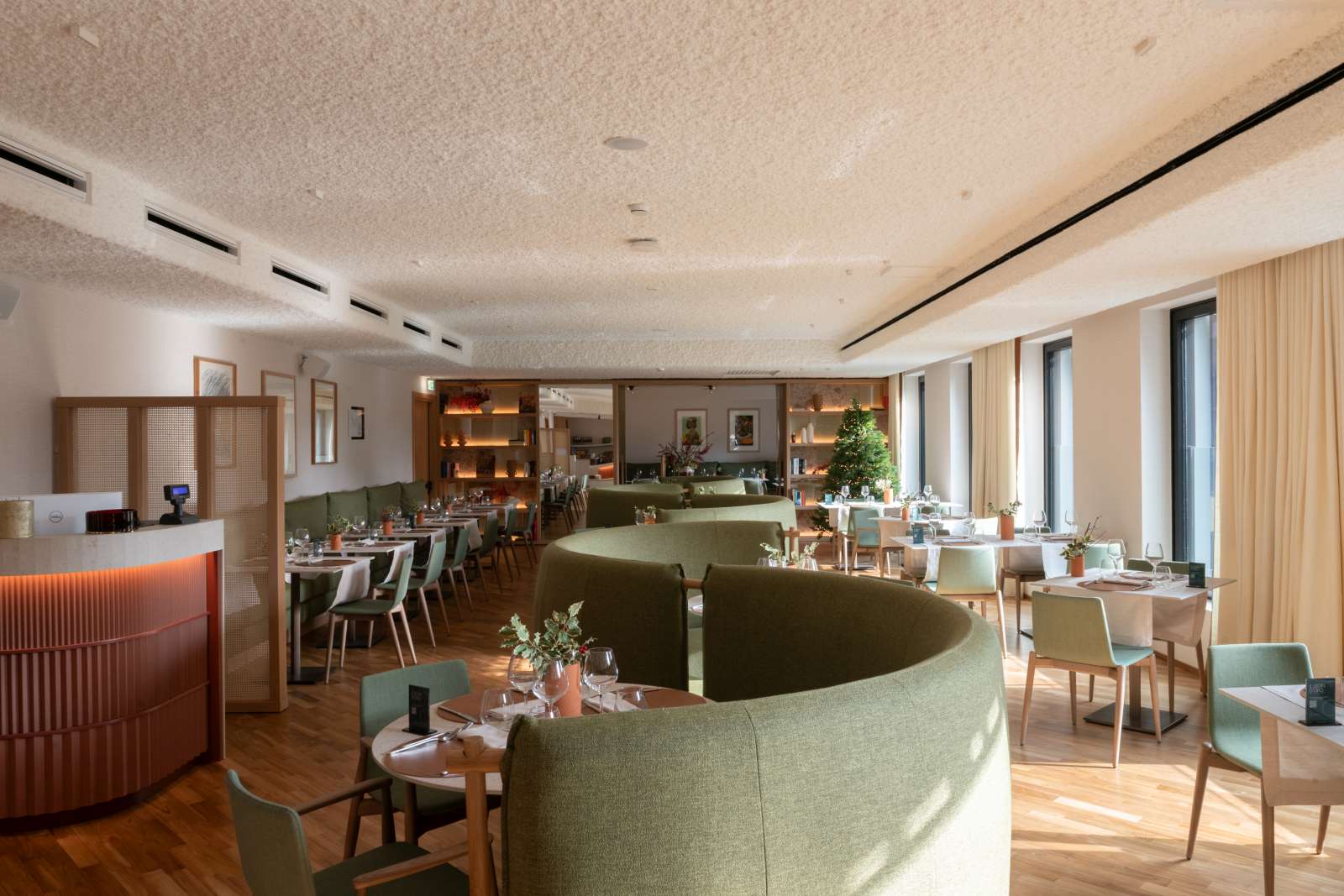 Il ristorante interno completa gli spazi condivisi, proponendosi come ambiente conviviale e raffinato. Pavimenti in legno naturale valorizzano l’atmosfera, mentre una sinuosa linea centrale di sedute imbottite definisce spazi semicircolari, raccolti e accoglienti. In asse con il layout longitudinale, un grande banco monolitico multifunzionale in gres porcellanato scandisce flussi, usi e identità dello spazio, destinato a colazioni, aperitivi e momenti di socialità.