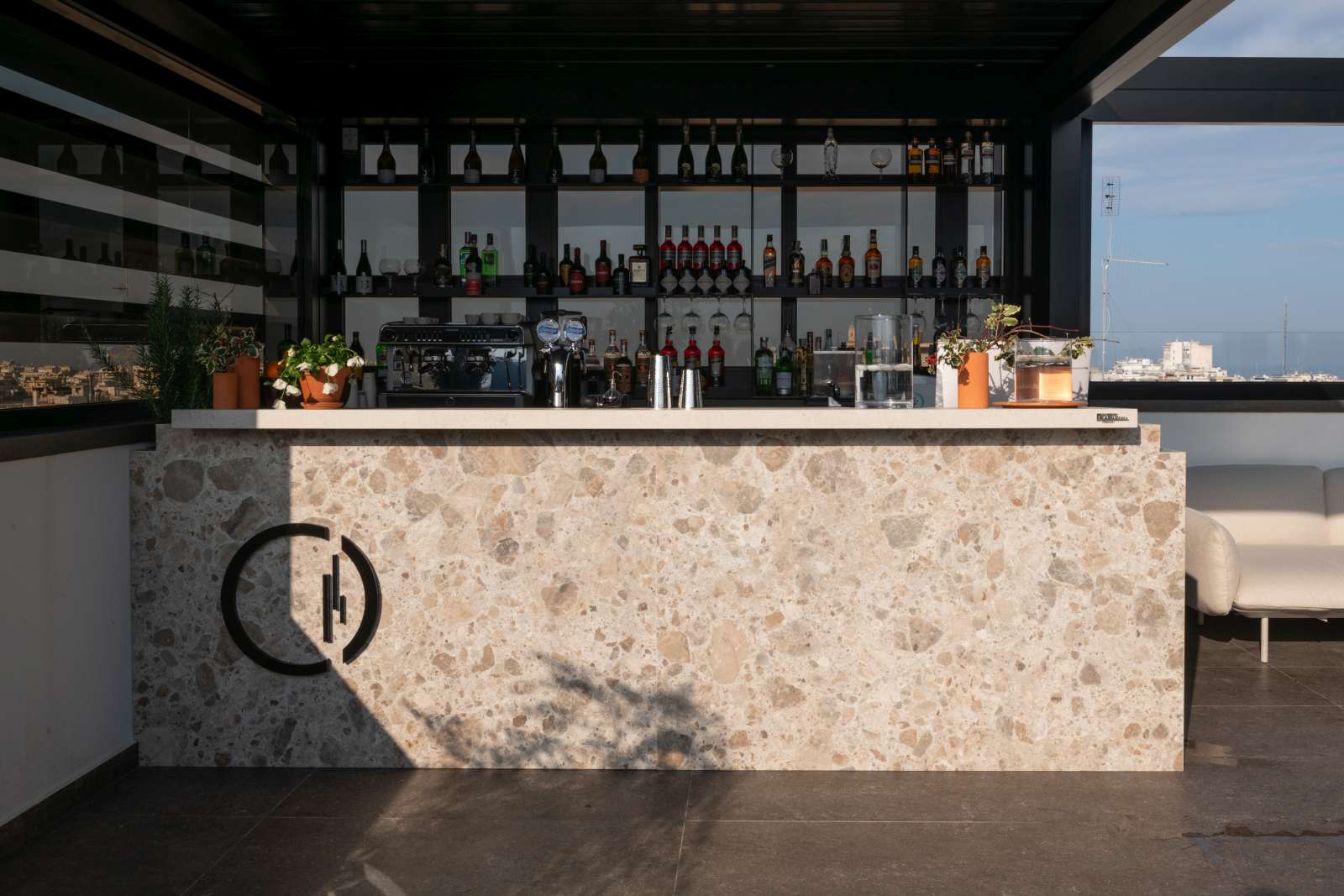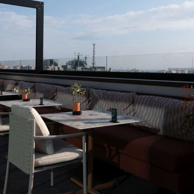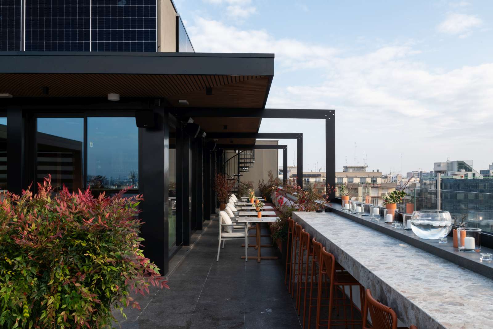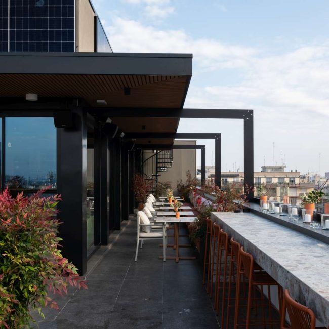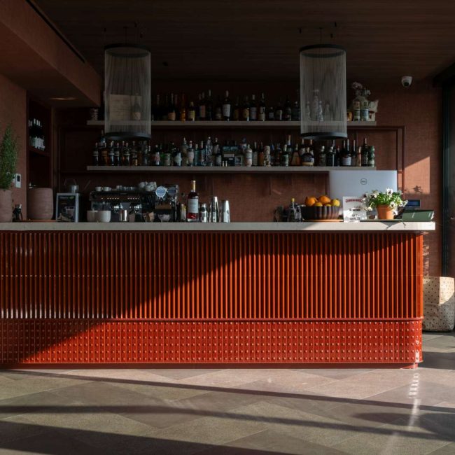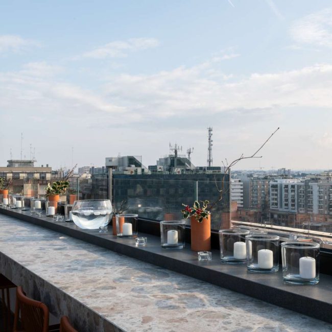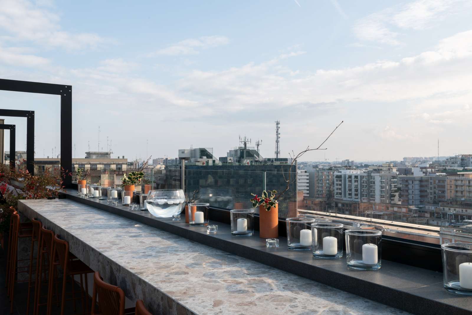 Elemento chiave del progetto è il roof garden panoramico al decimo piano, concepito come spazio aperto non solo agli ospiti, ma anche alla città. Il rooftop ospita lounge bar, area eventi e palestra, ridefinendo il rapporto tra l’edificio e il contesto urbano. Gli arredi — tavoli bassi, tavolini e banco alto per l’aperitivo rivolto verso lo skyline di Bari, fino al bar esterno — sono realizzati in grès porcellanato, materiale versatile e performante che unisce estetica e tecnologia, caratterizzati da cromie naturali ed effetto pietra. Un fil rouge materico lega ogni dettaglio, trasformando il gres in interprete del design e armonizzando forma, funzione e identità. Il volume del bar interno, rivestito con piastrelle Mutina in tonalità rossa/terracotta lucida, presenta texture tridimensionale che ne amplifica la presenza scenografica e valorizza la matericità.
