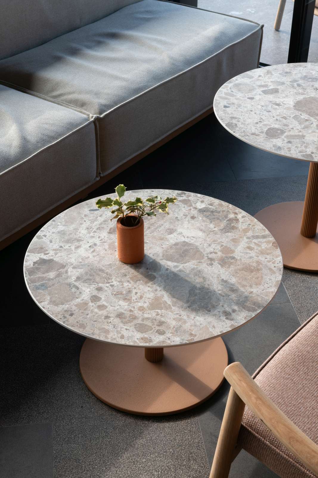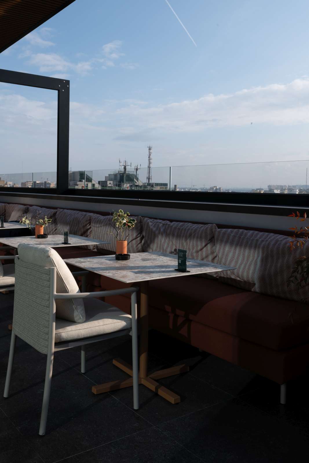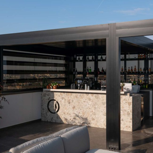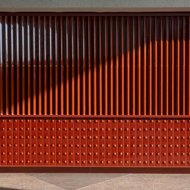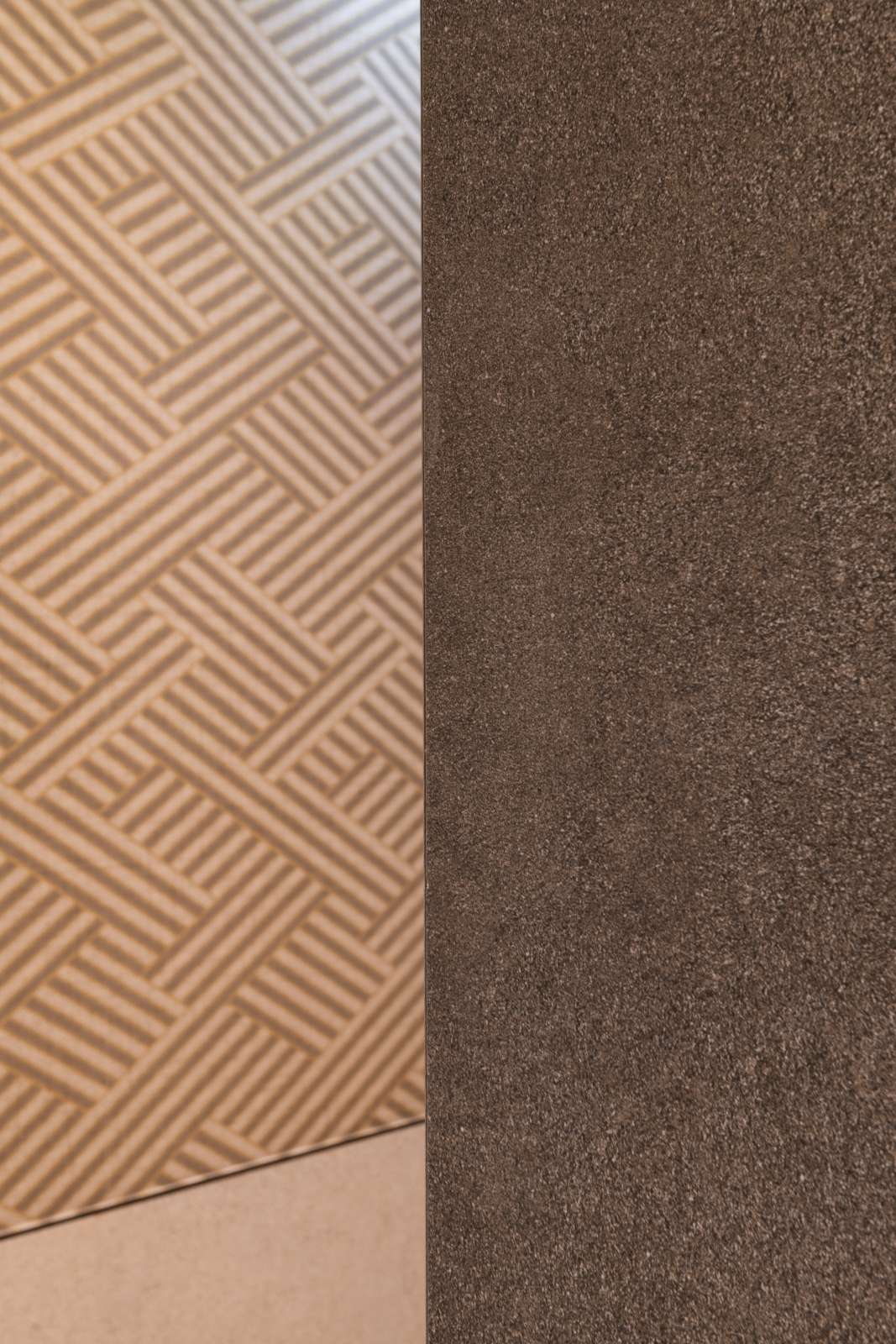 Elemento chiave del progetto è il roof garden panoramico al decimo piano, concepito come spazio aperto non solo agli ospiti, ma anche alla città. Il rooftop ospita lounge bar, area eventi e palestra, ridefinendo il rapporto tra l’edificio e il contesto urbano. Gli arredi — tavoli bassi, tavolini e banco alto per l’aperitivo rivolto verso lo skyline di Bari, fino al bar esterno — sono realizzati in grès porcellanato, materiale versatile e performante che unisce estetica e tecnologia, caratterizzati da cromie naturali ed effetto pietra. Un fil rouge materico lega ogni dettaglio, trasformando il gres in interprete del design e armonizzando forma, funzione e identità. Il volume del bar interno, rivestito con piastrelle Mutina in tonalità rossa/terracotta lucida, presenta texture tridimensionale che ne amplifica la presenza scenografica e valorizza la matericità.
