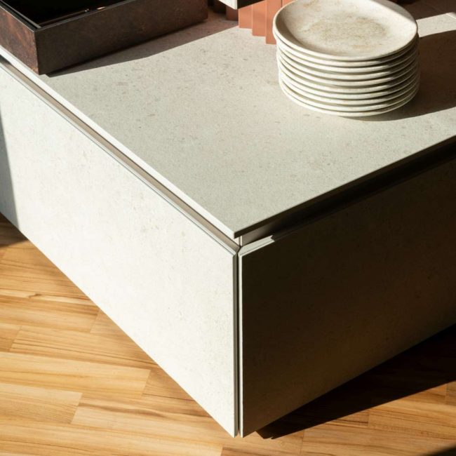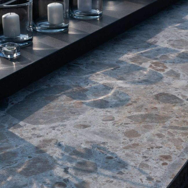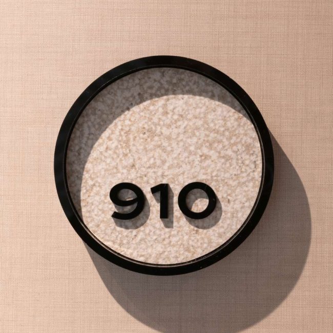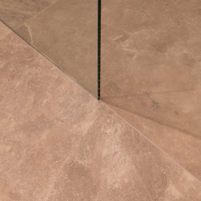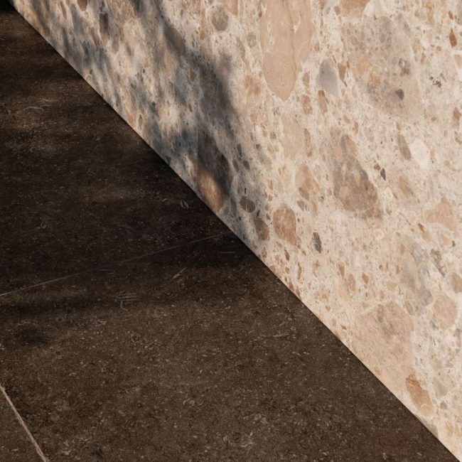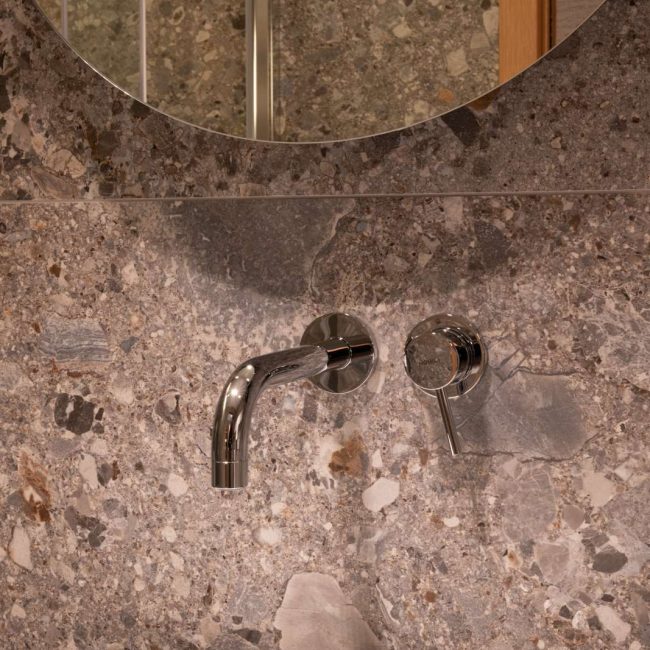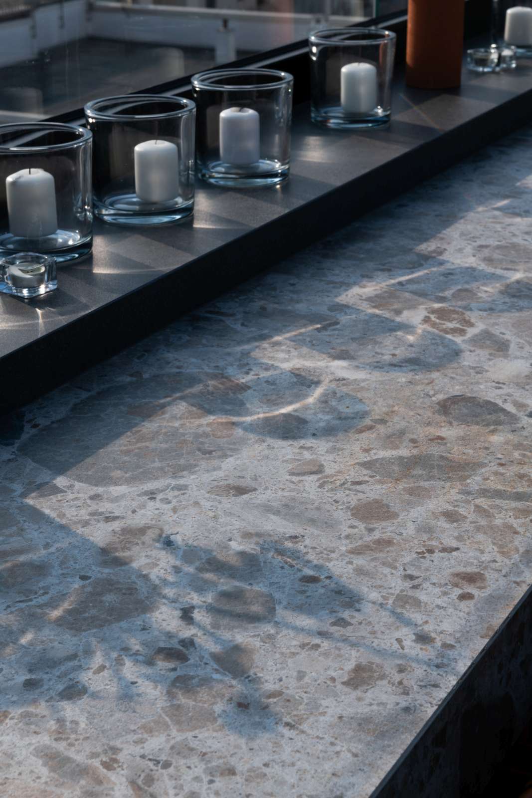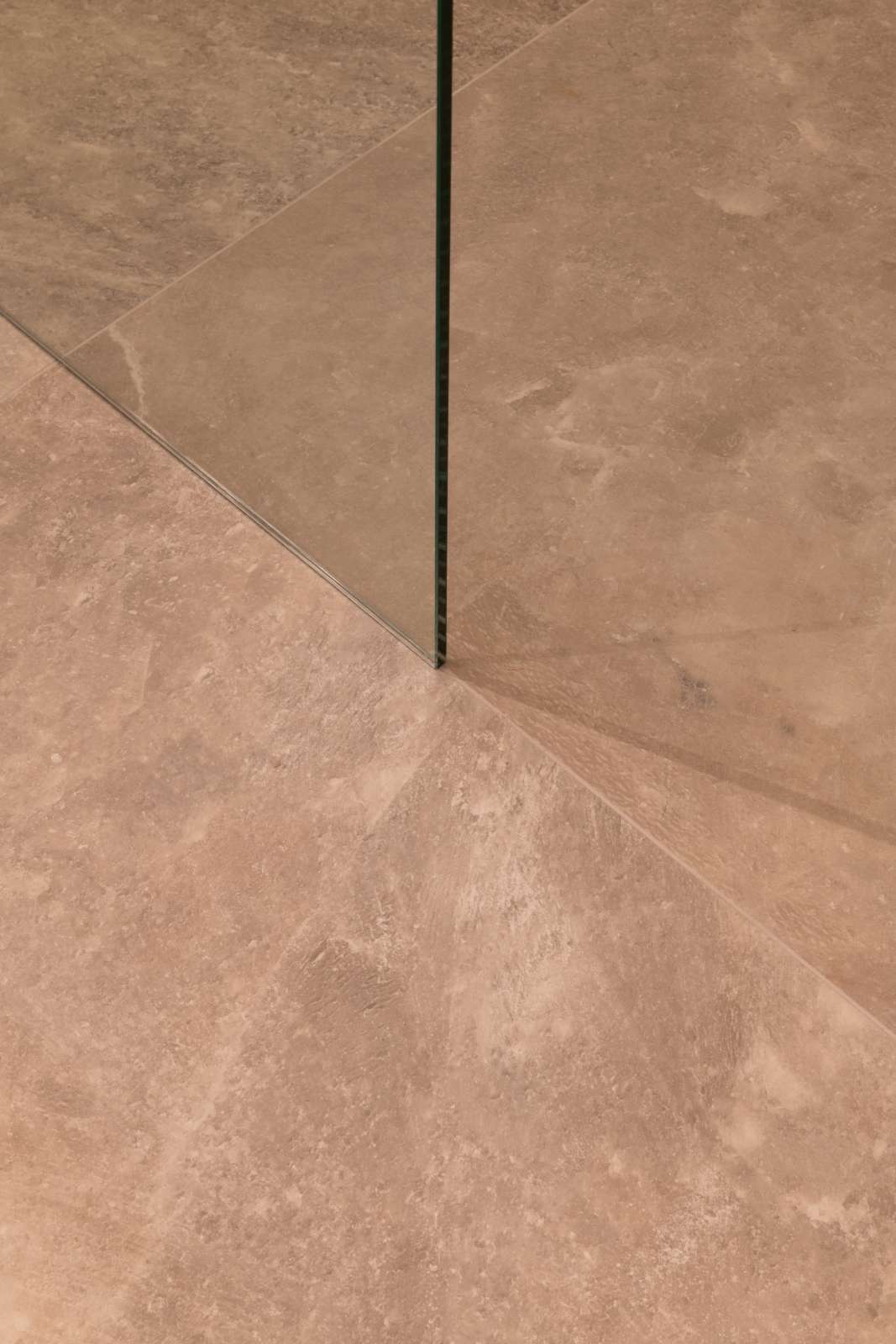 Elemento chiave del progetto è il roof garden panoramico al decimo piano, concepito come spazio aperto non solo agli ospiti, ma anche alla città. Il rooftop ospita lounge bar, area eventi e palestra, ridefinendo il rapporto tra l’edificio e il contesto urbano. Gli arredi — tavoli bassi, tavolini e banco alto per l’aperitivo rivolto verso lo skyline di Bari, fino al bar esterno — sono realizzati in grès porcellanato, materiale versatile e performante che unisce estetica e tecnologia, caratterizzati da cromie naturali ed effetto pietra. Un fil rouge materico lega ogni dettaglio, trasformando il gres in interprete del design e armonizzando forma, funzione e identità. Il volume del bar interno, rivestito con piastrelle Mutina in tonalità rossa/terracotta lucida, presenta texture tridimensionale che ne amplifica la presenza scenografica e valorizza la matericità.