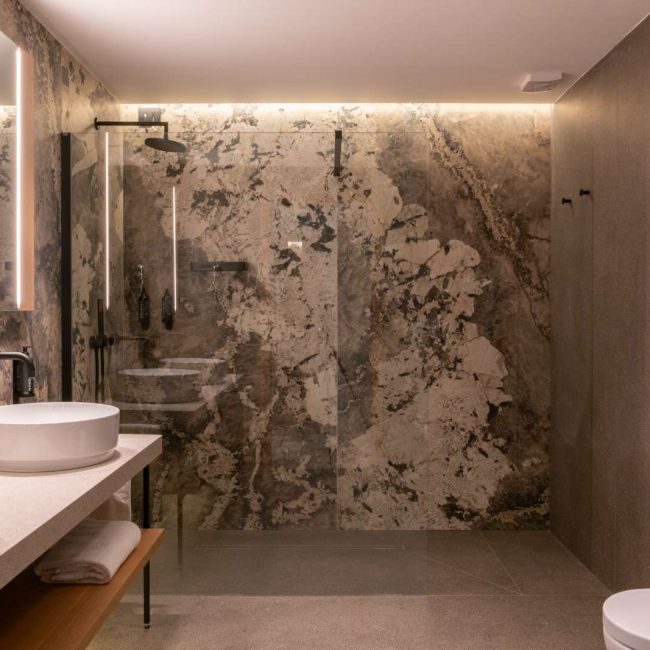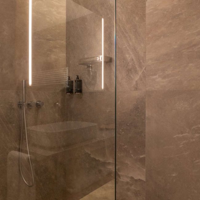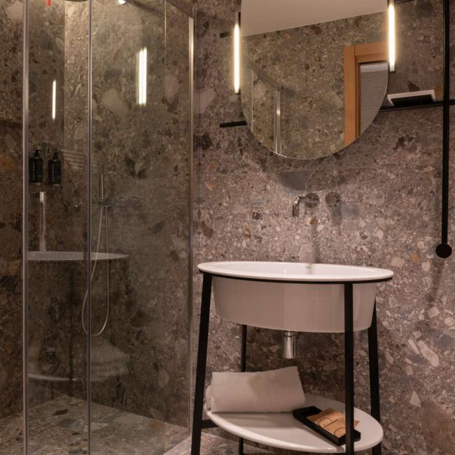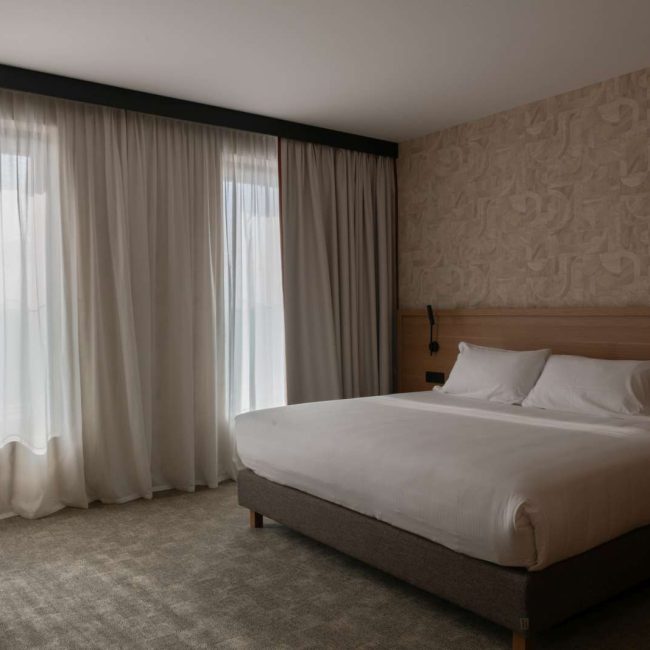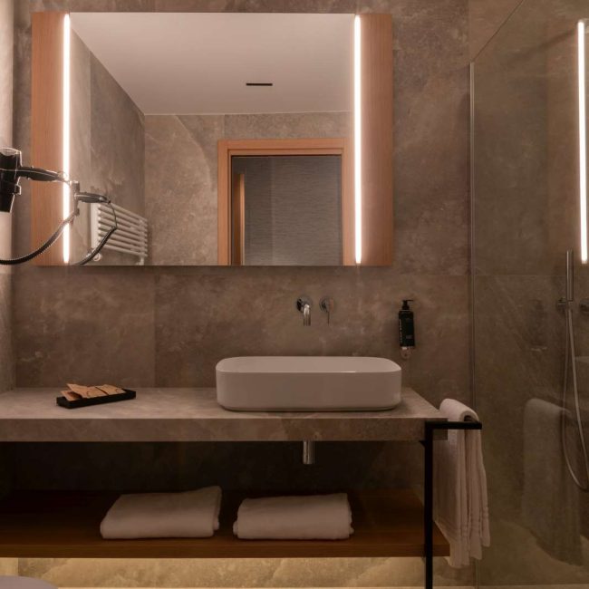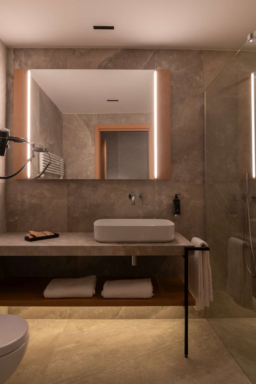 L’hotel dispone di 74 camere, tra singole, doppie, superior, triple e junior suite, progettate con criteri di razionalità distributiva, comfort e sobrietà formale, rispettando un restyling alberghiero attuale ed una nuova idea di ospitalità. Gli interni combinano finiture contemporanee, boiserie in legno chiaro e carte da parati materiche dalle delicate nuance beige, per un ambiente armonioso e accogliente. Particolare attenzione è stata dedicata ai bagni, concepiti come spazi di benessere più che di servizio, con cromie calde e terrose tra beige, marroni e rossastre. Nelle Superior, la grande parete doccia in gres porcellanato diventa un fondale scenografico, mentre la doccia a filo pavimento e la rubinetteria integrata definiscono un’estetica essenziale. Il mobile lavabo lineare con doppi lavabi e piano inferiore in legno aggiunge calore, e lo specchio retroilluminato amplifica profondità e luce, integrandosi armoniosamente nello spazio.