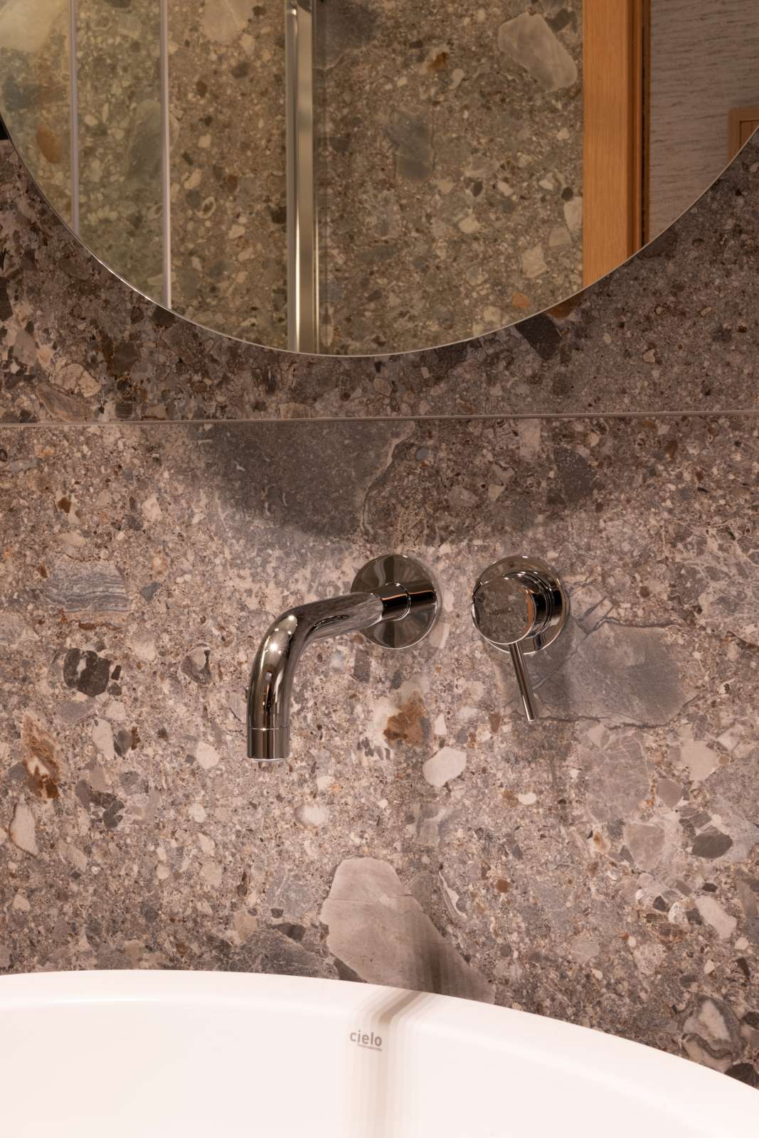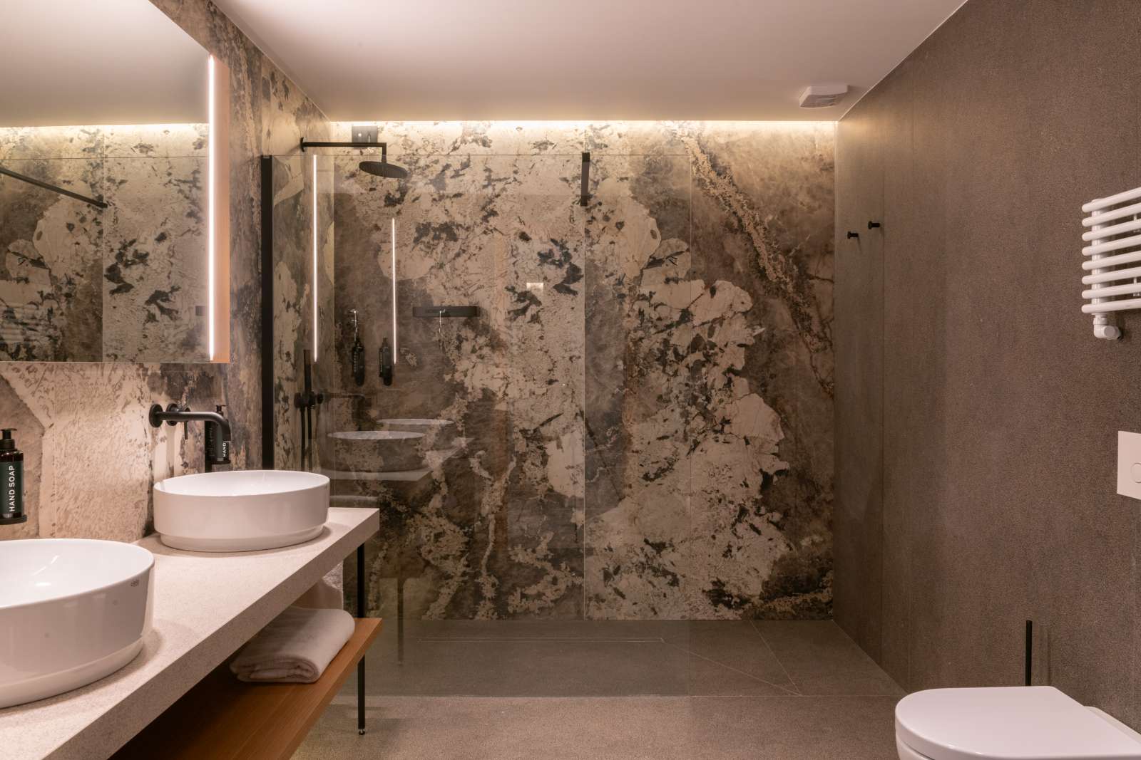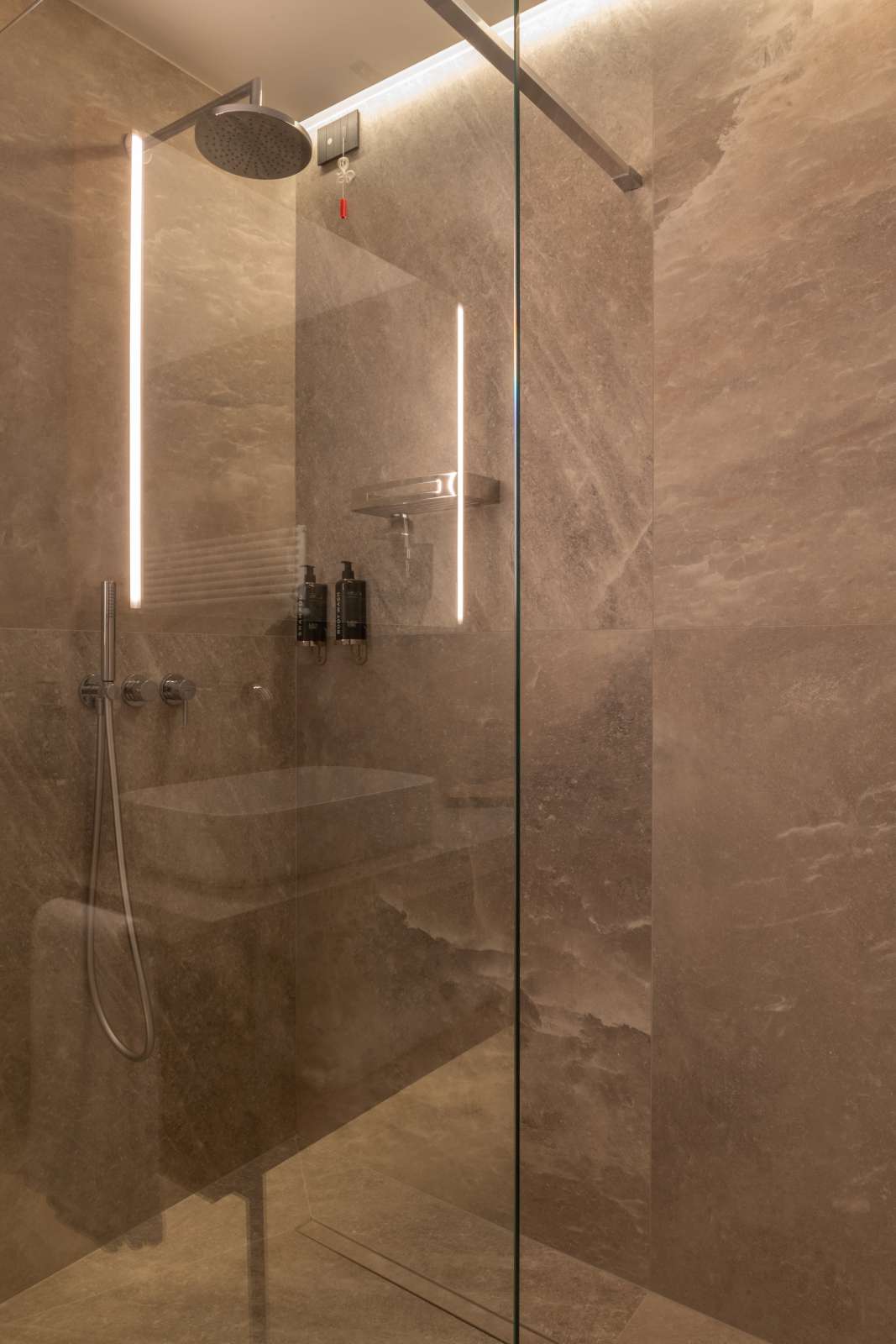 L’hotel dispone di 74 camere, tra singole, doppie, superior, triple e junior suite, progettate con criteri di razionalità distributiva, comfort e sobrietà formale, rispettando un restyling alberghiero attuale ed una nuova idea di ospitalità. Gli interni combinano finiture contemporanee, boiserie in legno chiaro e carte da parati materiche dalle delicate nuance beige, per un ambiente armonioso e accogliente. Particolare attenzione è stata dedicata ai bagni, concepiti come spazi di benessere più che di servizio, con cromie calde e terrose tra beige, marroni e rossastre. Nelle Superior, la grande parete doccia in gres porcellanato diventa un fondale scenografico, mentre la doccia a filo pavimento e la rubinetteria integrata definiscono un’estetica essenziale. Il mobile lavabo lineare con doppi lavabi e piano inferiore in legno aggiunge calore, e lo specchio retroilluminato amplifica profondità e luce, integrandosi armoniosamente nello spazio.