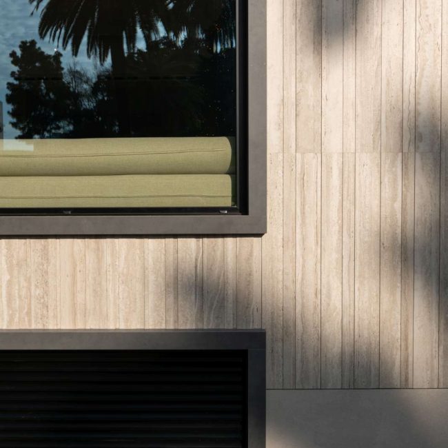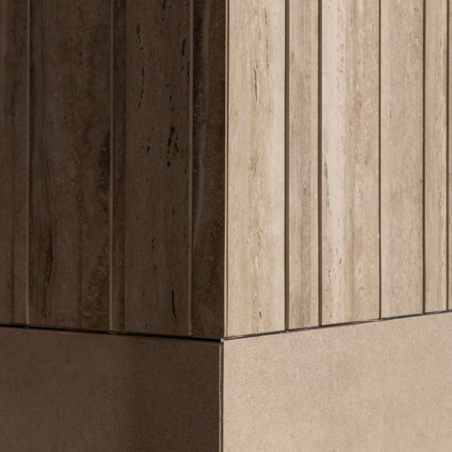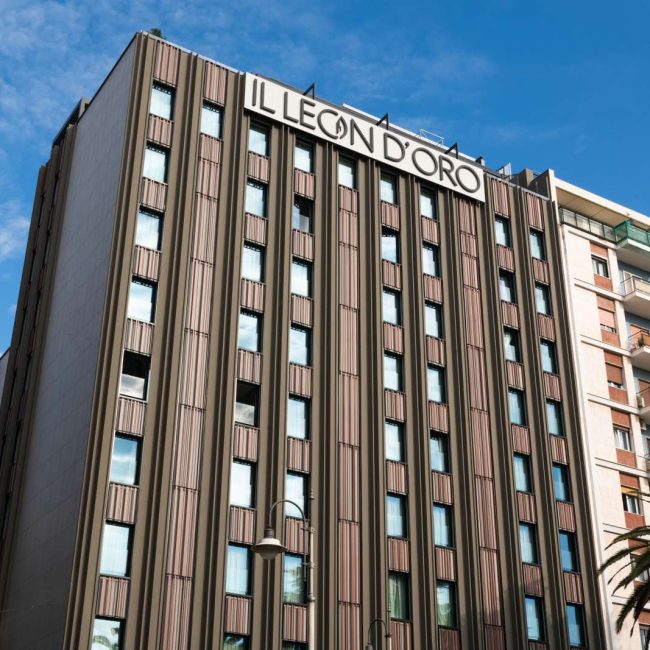 Corpo architettonico riconoscibile nello skyline per la sua altezza e per la storica insegna sommitale, il Leon d’Oro conserva il suo ruolo iconico aggiornandosi sotto i profili funzionale, tecnologico ed energetico. La facciata si sviluppa come un organismo compatto e rigoroso, dominato da una forte verticalità, scandita da setti regolari e dall’alternanza di materiali selezionati con cura. I rivestimenti, dalle cromie calde e dalle trame geometriche armoniose, dialogano con le strette finestre incassate tra le lame strutturali, creando un ritmo visivo elegante e una chiara identità architettonica.
