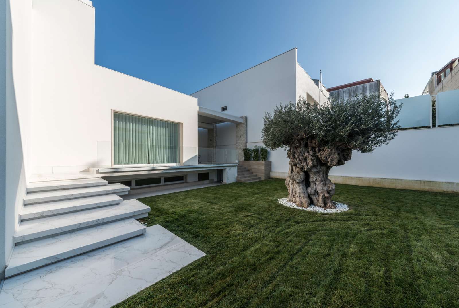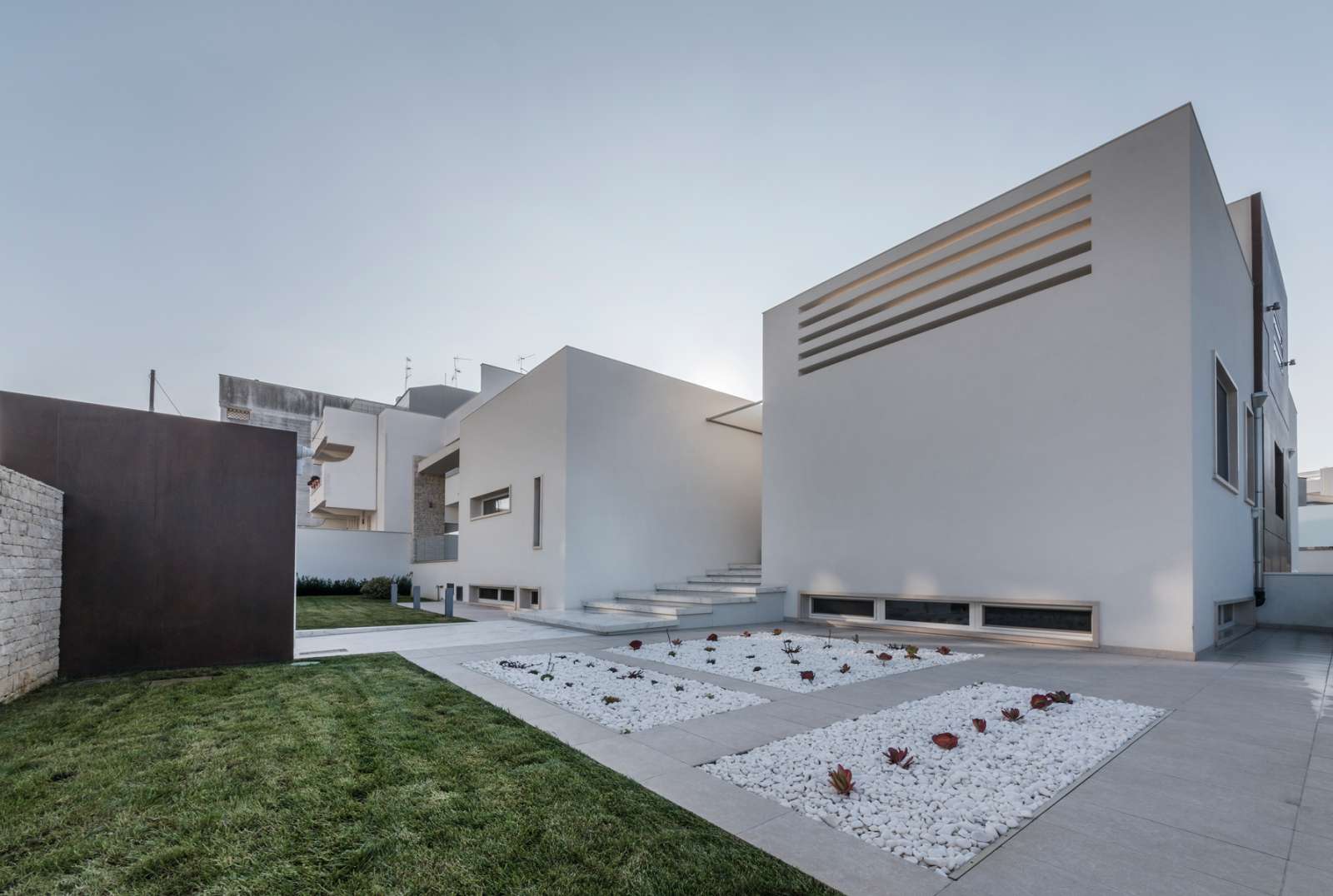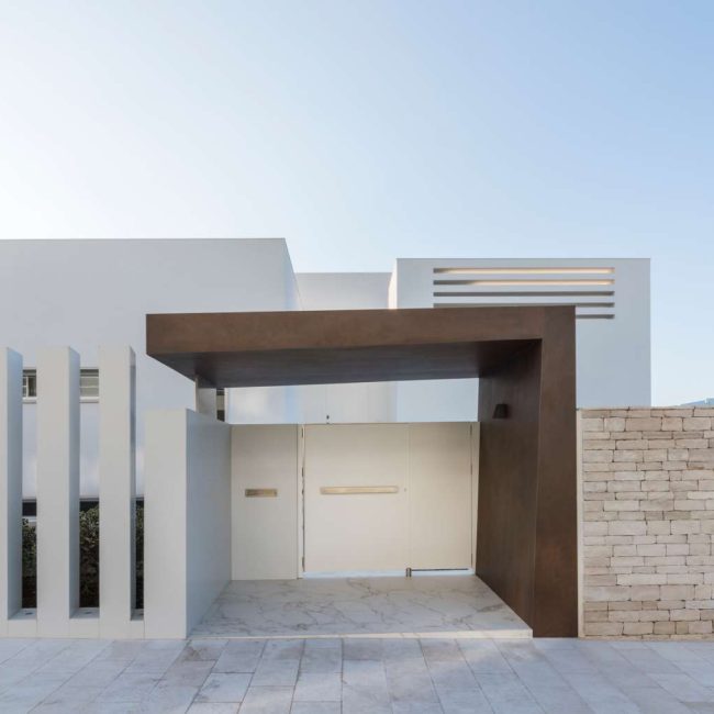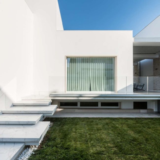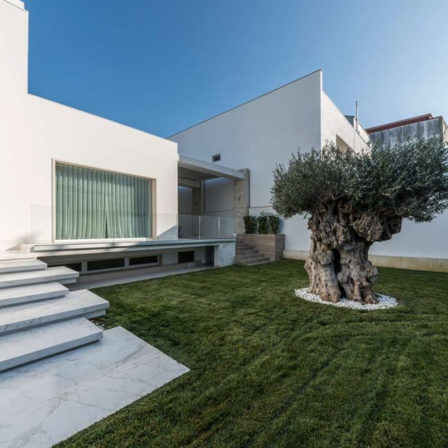 La magnifica villa di cui vedremo alcuni scatti in queste pagine, può essere pienamente considerata un esempio di come trovare armonia architettonica, costruendo nuovi edifici in un contesto già fortemente urbanizzato. Il laboratorio di progettazione “La Bottega sul Ponte”, sapientemente organizzato da una progettista eclettica ed elegante quale Teresa Costantini, mira a creare armonia con il contesto in cui l’edificio si inserisce. Come si può notare, la progettista che ha seguito i lavori, Maddalena Lazzaro, ha proposto un concetto fatto di forme semplici e volumi forti, che non vanno mai sopra le righe. Eleganza nella purezza, sogliono dire i giapponesi. Un concetto che in queste linee pure e in queste geometrie di un’eleganza sorprendente, si riconoscono in maniera cristallina. Proprio quest’armonia di linee e colori sobri, ha fatto sì che la villa si inserisse in un contesto già cristallizzato, come il tessuto urbano di Adelfia: una dimora dal gusto moderno dove, per richiesta del committente, il piano abitativo è stato disposto su un unico livello. Questa particolarità ha, di conseguenza, impostato gli spazi dedicati alla vita e al riposo, unicamente al piano rialzato, lasciando al piano interrato il compito di ospitare garage e vano deposito ed al primo piano, quello di ospitare gli impianti. Grandi volumi puri si incastrano tra loro e vengono scanditi dai colori e dalla luminosità. Il bianco domina il progetto nelle pareti esterne, come negli ambienti interni: le geometrie delle aperture, si richiamano tra loro nelle diafane facciate, nei vuoti e negli stacchi netti per poi sublimare nella grande pensilina d’ingresso, rivestita interamente in lastre di gres effetto corten, e creando un dinamismo cromatico che sfuma nuovamente nel bianco di setti murari in lapitec bianchi di diverse larghezze, i quali si avvicendano in un passo ritmico che rimanda ai volumi retrostanti. Ad avvolgere e proteggere è poi un muro in pietra, che recinta con eleganza la villa richiamandosi al contempo allo stile tipico pugliese. Entrando all’interno si resta colpiti dalla materia che – preziosamente – rimanda ai colori e all’armonia dei materiali usati all’esterno: grandi lastre in kerlite effetto marmo calacatta, nella zona giorno e nel bagno padronale, illuminano i pochi, delicati, elementi che ne compongono l’arredo. Ampi volumi vengono lasciati liberi da orpelli che risulterebbero d’ostacolo alla bellezza del bianco: i mobili e le porte, realizzati su disegno, sembrano quasi nascondersi nei tenui colori e nell’impostazione a scomparsa. Dulcis in fundo, è la maestosa scala interna, collocata in posizione centrale rispetto a tutto il piano: in tal modo, non è solo il fulcro spaziale, ma anche estetico del progetto, grazie allo snodo dei volumi che si configurano a diverse altezze, protetti da teche di vetro. Un bianco razionalismo è il risultato finale di questo progetto dalle superfici maestose e dallo stile spiccatamente moderno che, tuttavia, non stona nel contesto preesistente.