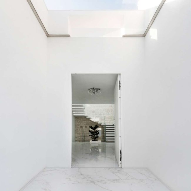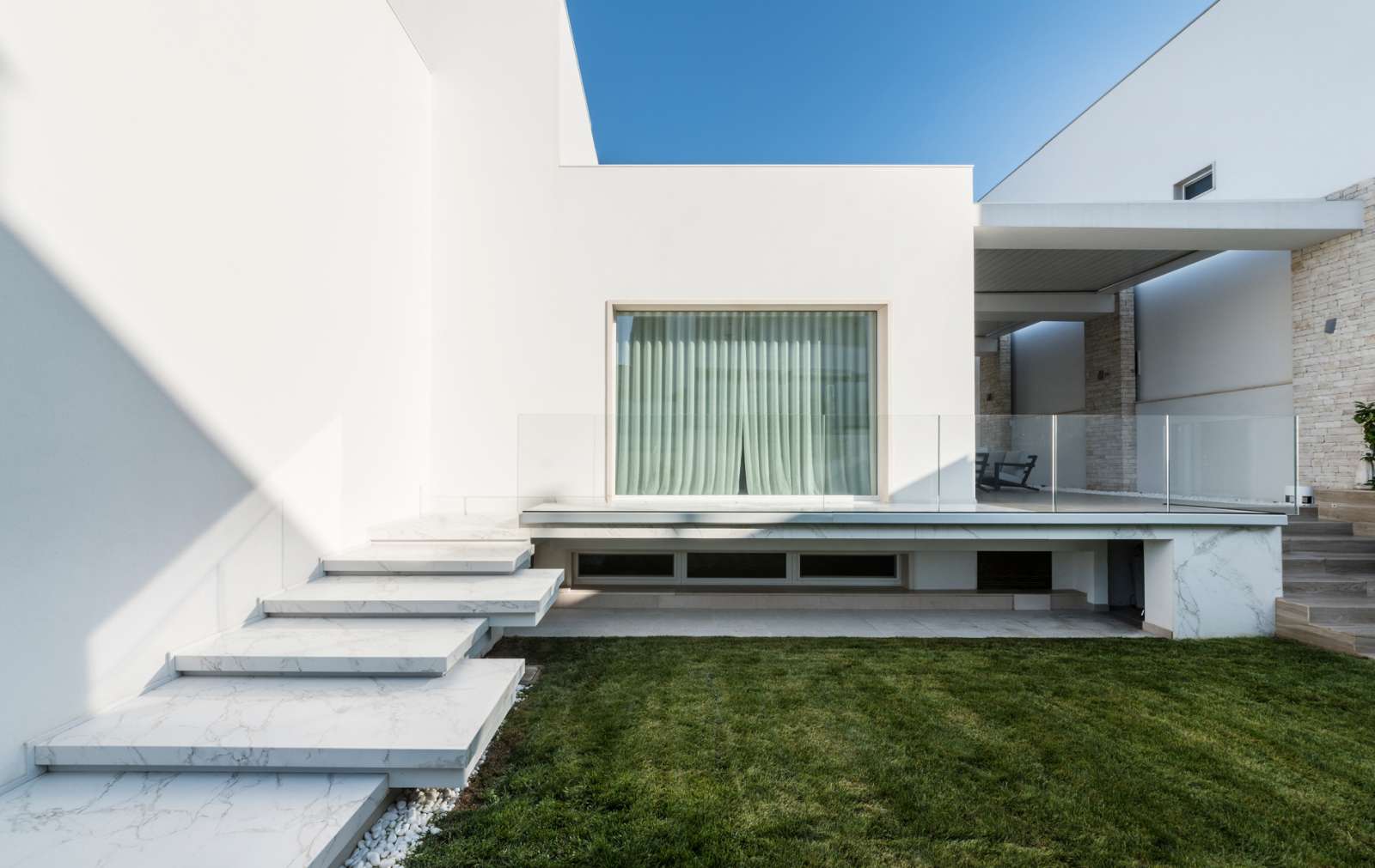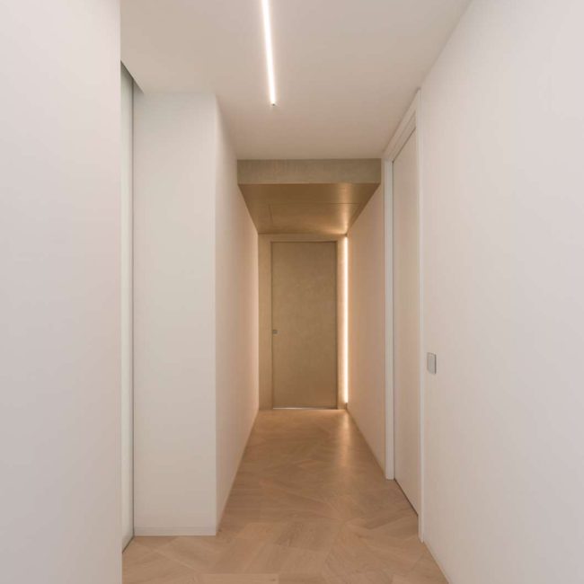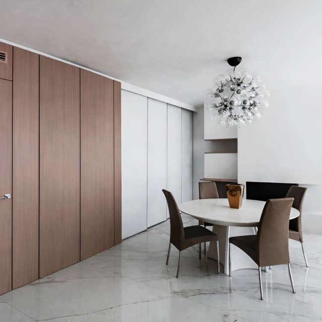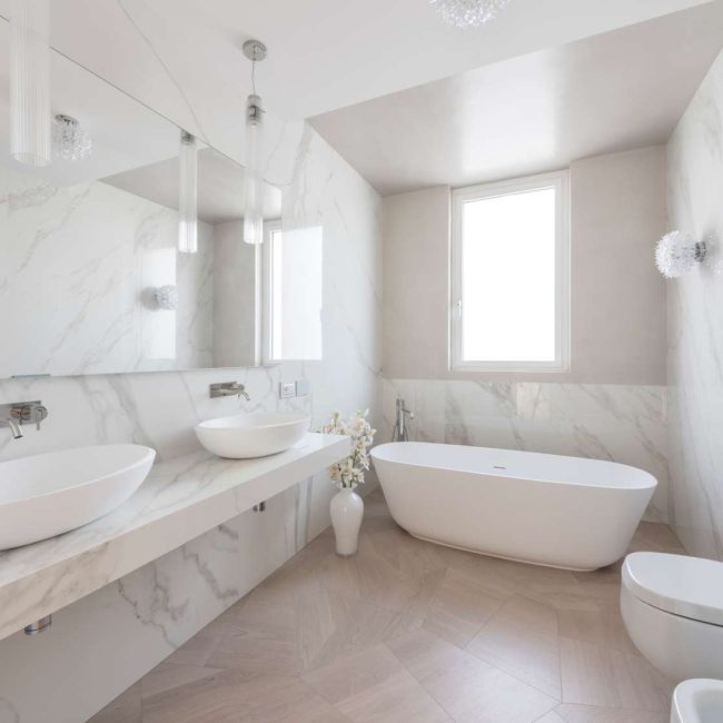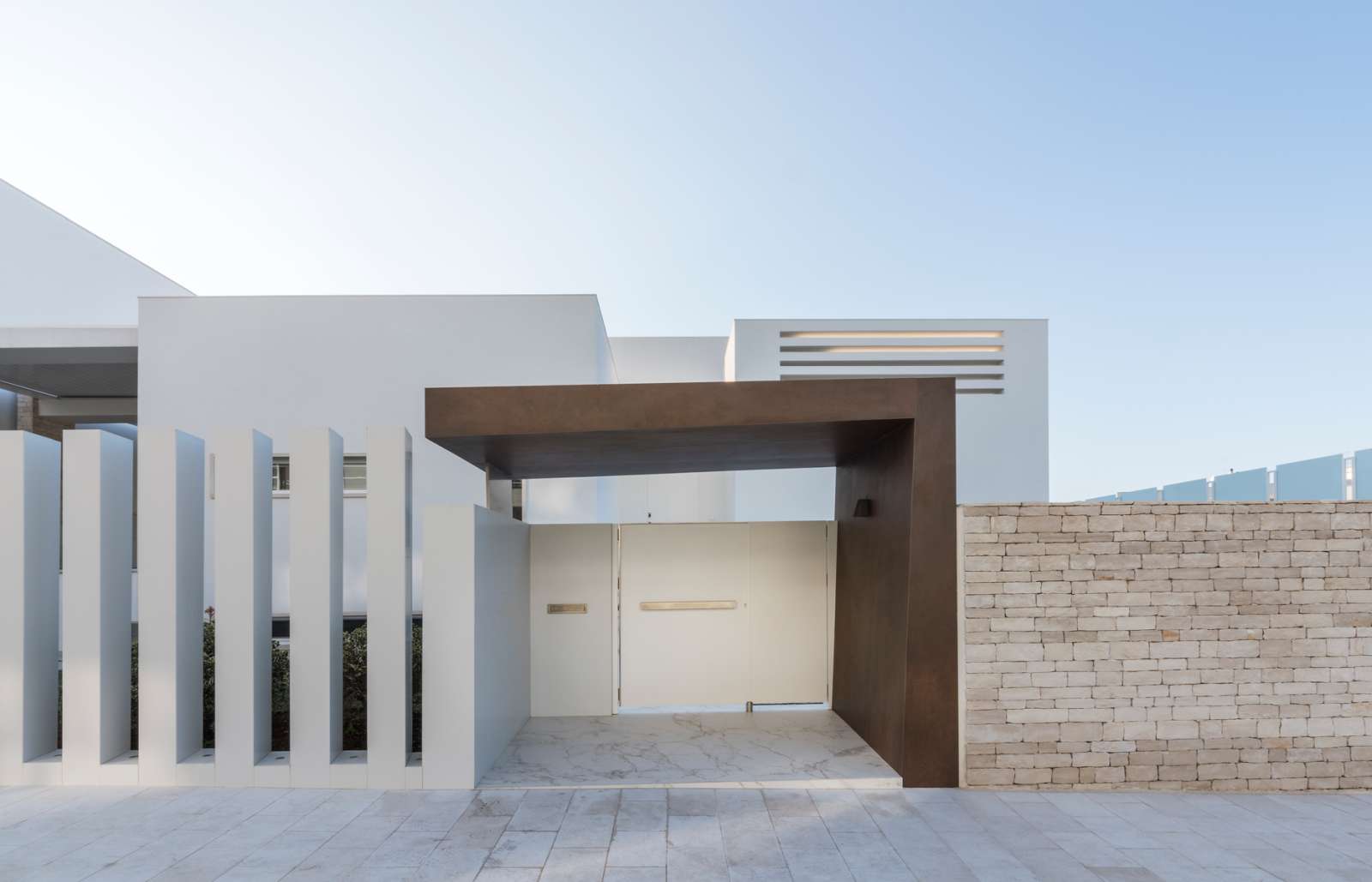 La magnifica villa di cui vedremo alcuni scatti in queste pagine, può essere pienamente considerata un esempio di come trovare armonia architettonica, costruendo nuovi edifici in un contesto già fortemente urbanizzato. Il laboratorio di progettazione “La Bottega sul Ponte”, sapientemente organizzato da una progettista eclettica ed elegante quale Teresa Costantini, mira a creare armonia con il contesto in cui l’edificio si inserisce. Come si può notare, la progettista che ha seguito i lavori, Maddalena Lazzaro, ha proposto un concetto fatto di forme semplici e volumi forti, che non vanno mai sopra le righe. Eleganza nella purezza, sogliono dire i giapponesi. Un concetto che in queste linee pure e in queste geometrie di un’eleganza sorprendente, si riconoscono in maniera cristallina. Proprio quest’armonia di linee e colori sobri, ha fatto sì che la villa si inserisse in un contesto già cristallizzato, come il tessuto urbano di Adelfia: una dimora dal gusto moderno dove, per richiesta del committente, il piano abitativo è stato disposto su un unico livello. Questa particolarità ha, di conseguenza, impostato gli spazi dedicati alla vita e al riposo, unicamente al piano rialzato, lasciando al piano interrato il compito di ospitare garage e vano deposito ed al primo piano, quello di ospitare gli impianti. Grandi volumi puri si incastrano tra loro e vengono scanditi dai colori e dalla luminosità. Il bianco domina il progetto nelle pareti esterne, come negli ambienti interni: le geometrie delle aperture, si richiamano tra loro nelle diafane facciate, nei vuoti e negli stacchi netti per poi sublimare nella grande pensilina d’ingresso, rivestita interamente in lastre di gres effetto corten, e creando un dinamismo cromatico che sfuma nuovamente nel bianco di setti murari in lapitec bianchi di diverse larghezze, i quali si avvicendano in un passo ritmico che rimanda ai volumi retrostanti. Ad avvolgere e proteggere è poi un muro in pietra, che recinta con eleganza la villa richiamandosi al contempo allo stile tipico pugliese. Entrando all’interno si resta colpiti dalla materia che – preziosamente – rimanda ai colori e all’armonia dei materiali usati all’esterno: grandi lastre in kerlite effetto marmo calacatta, nella zona giorno e nel bagno padronale, illuminano i pochi, delicati, elementi che ne compongono l’arredo. Ampi volumi vengono lasciati liberi da orpelli che risulterebbero d’ostacolo alla bellezza del bianco: i mobili e le porte, realizzati su disegno, sembrano quasi nascondersi nei tenui colori e nell’impostazione a scomparsa. Dulcis in fundo, è la maestosa scala interna, collocata in posizione centrale rispetto a tutto il piano: in tal modo, non è solo il fulcro spaziale, ma anche estetico del progetto, grazie allo snodo dei volumi che si configurano a diverse altezze, protetti da teche di vetro. Un bianco razionalismo è il risultato finale di questo progetto dalle superfici maestose e dallo stile spiccatamente moderno che, tuttavia, non stona nel contesto preesistente.