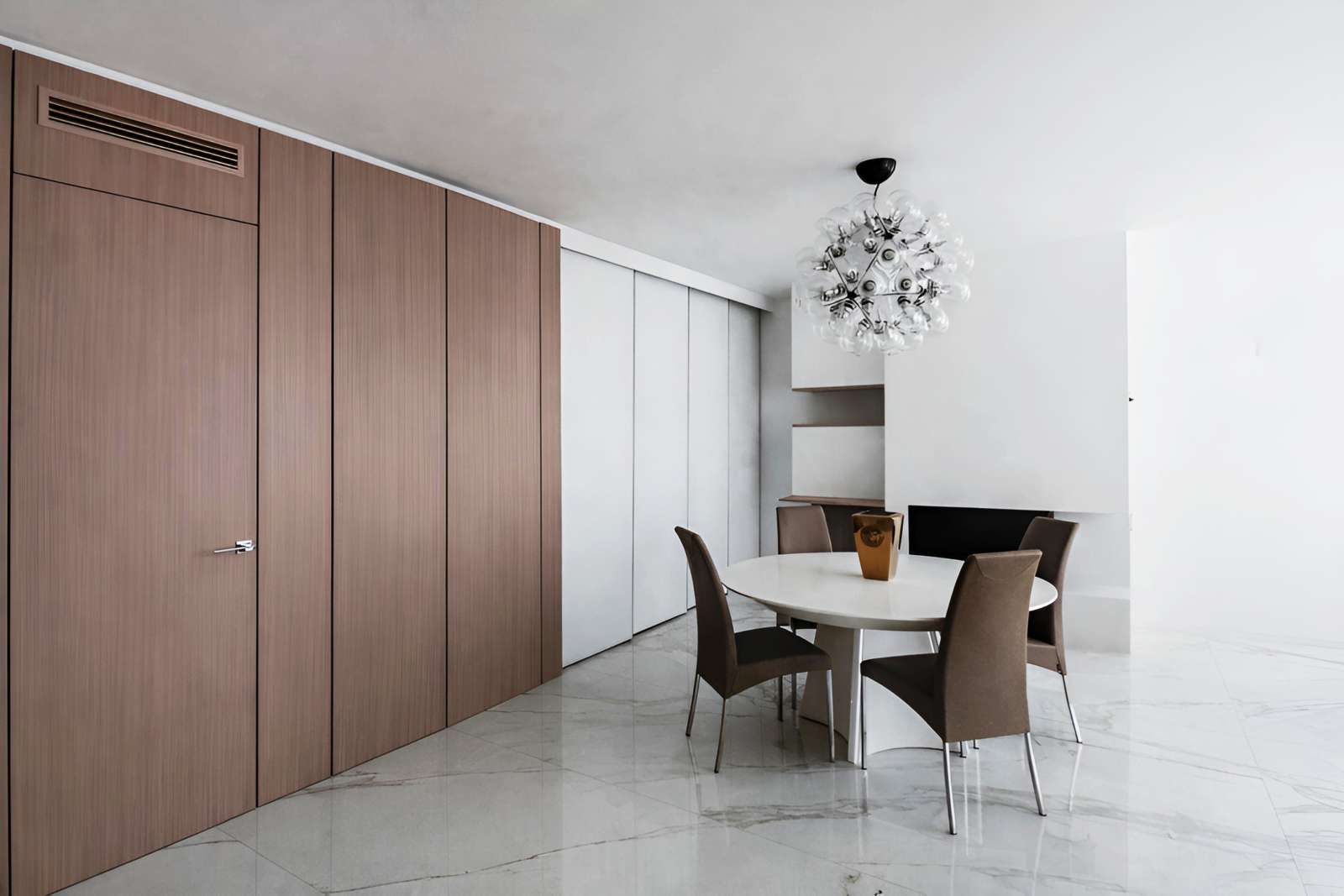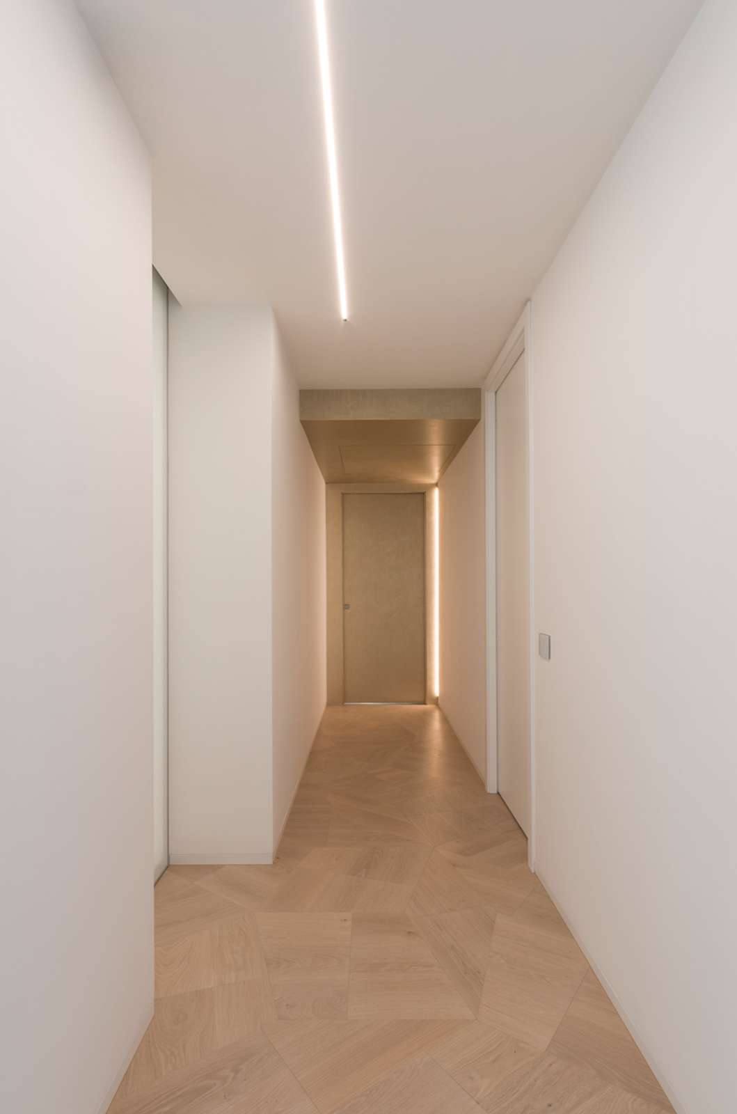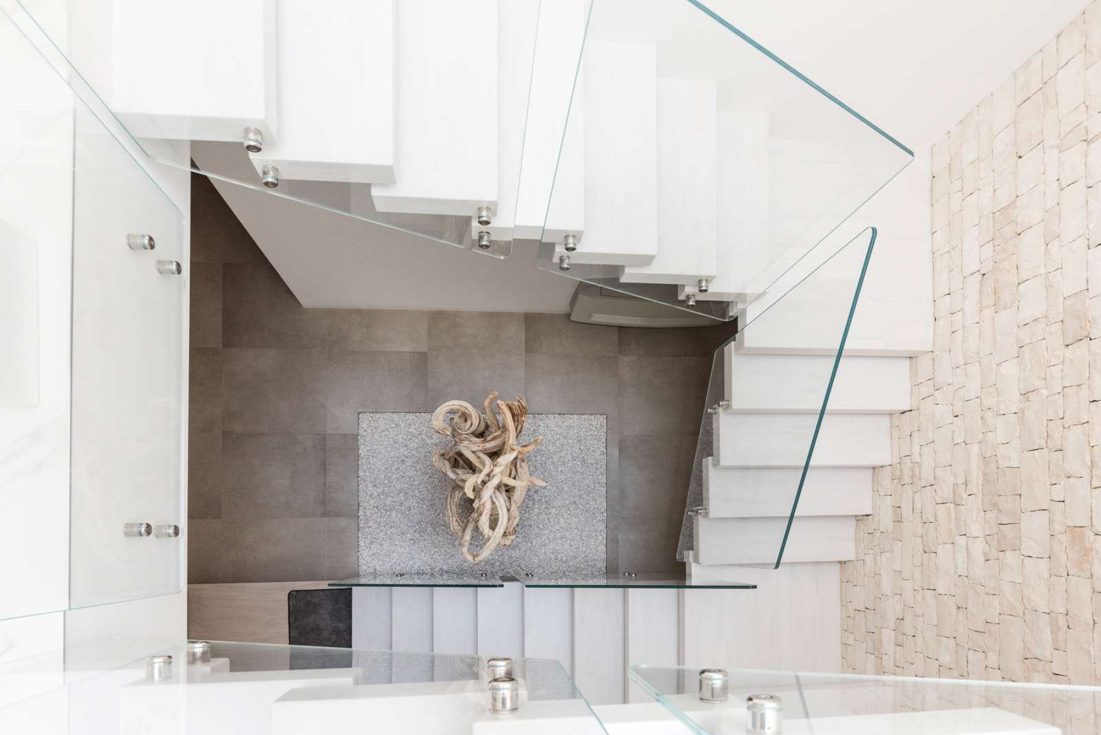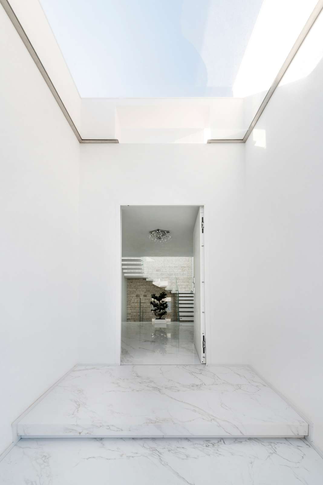 La magnifica villa di cui vedremo alcuni scatti in queste pagine, può essere pienamente considerata un esempio di come trovare armonia architettonica, costruendo nuovi edifici in un contesto già fortemente urbanizzato. Il laboratorio di progettazione “La Bottega sul Ponte”, sapientemente organizzato da una progettista eclettica ed elegante quale Teresa Costantini, mira a creare armonia con il contesto in cui l’edificio si inserisce. Come si può notare, la progettista che ha seguito i lavori, Maddalena Lazzaro, ha proposto un concetto fatto di forme semplici e volumi forti, che non vanno mai sopra le righe. Eleganza nella purezza, sogliono dire i giapponesi. Un concetto che in queste linee pure e in queste geometrie di un’eleganza sorprendente, si riconoscono in maniera cristallina. Proprio quest’armonia di linee e colori sobri, ha fatto sì che la villa si inserisse in un contesto già cristallizzato, come il tessuto urbano di Adelfia: una dimora dal gusto moderno dove, per richiesta del committente, il piano abitativo è stato disposto su un unico livello. Questa particolarità ha, di conseguenza, impostato gli spazi dedicati alla vita e al riposo, unicamente al piano rialzato, lasciando al piano interrato il compito di ospitare garage e vano deposito ed al primo piano, quello di ospitare gli impianti. Grandi volumi puri si incastrano tra loro e vengono scanditi dai colori e dalla luminosità. Il bianco domina il progetto nelle pareti esterne, come negli ambienti interni: le geometrie delle aperture, si richiamano tra loro nelle diafane facciate, nei vuoti e negli stacchi netti per poi sublimare nella grande pensilina d’ingresso, rivestita interamente in lastre di gres effetto corten, e creando un dinamismo cromatico che sfuma nuovamente nel bianco di setti murari in lapitec bianchi di diverse larghezze, i quali si avvicendano in un passo ritmico che rimanda ai volumi retrostanti. Ad avvolgere e proteggere è poi un muro in pietra, che recinta con eleganza la villa richiamandosi al contempo allo stile tipico pugliese. Entrando all’interno si resta colpiti dalla materia che – preziosamente – rimanda ai colori e all’armonia dei materiali usati all’esterno: grandi lastre in kerlite effetto marmo calacatta, nella zona giorno e nel bagno padronale, illuminano i pochi, delicati, elementi che ne compongono l’arredo. Ampi volumi vengono lasciati liberi da orpelli che risulterebbero d’ostacolo alla bellezza del bianco: i mobili e le porte, realizzati su disegno, sembrano quasi nascondersi nei tenui colori e nell’impostazione a scomparsa. Dulcis in fundo, è la maestosa scala interna, collocata in posizione centrale rispetto a tutto il piano: in tal modo, non è solo il fulcro spaziale, ma anche estetico del progetto, grazie allo snodo dei volumi che si configurano a diverse altezze, protetti da teche di vetro. Un bianco razionalismo è il risultato finale di questo progetto dalle superfici maestose e dallo stile spiccatamente moderno che, tuttavia, non stona nel contesto preesistente.